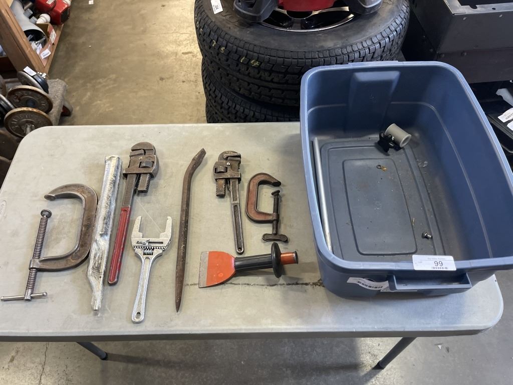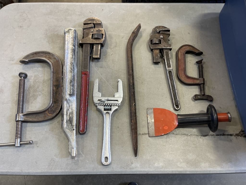 LARGE C CLAMP, PIPE WRENCHES, PRY BAR AND MORE