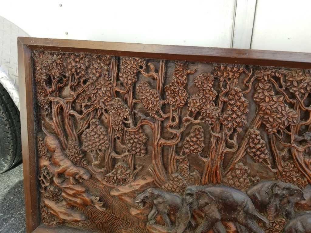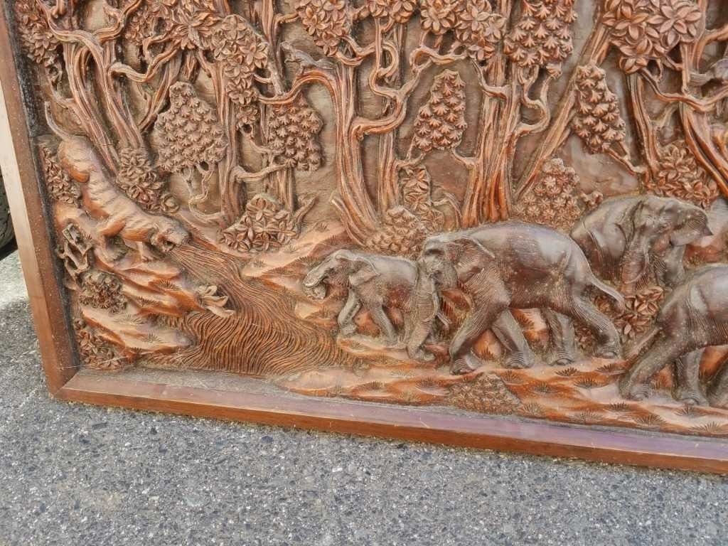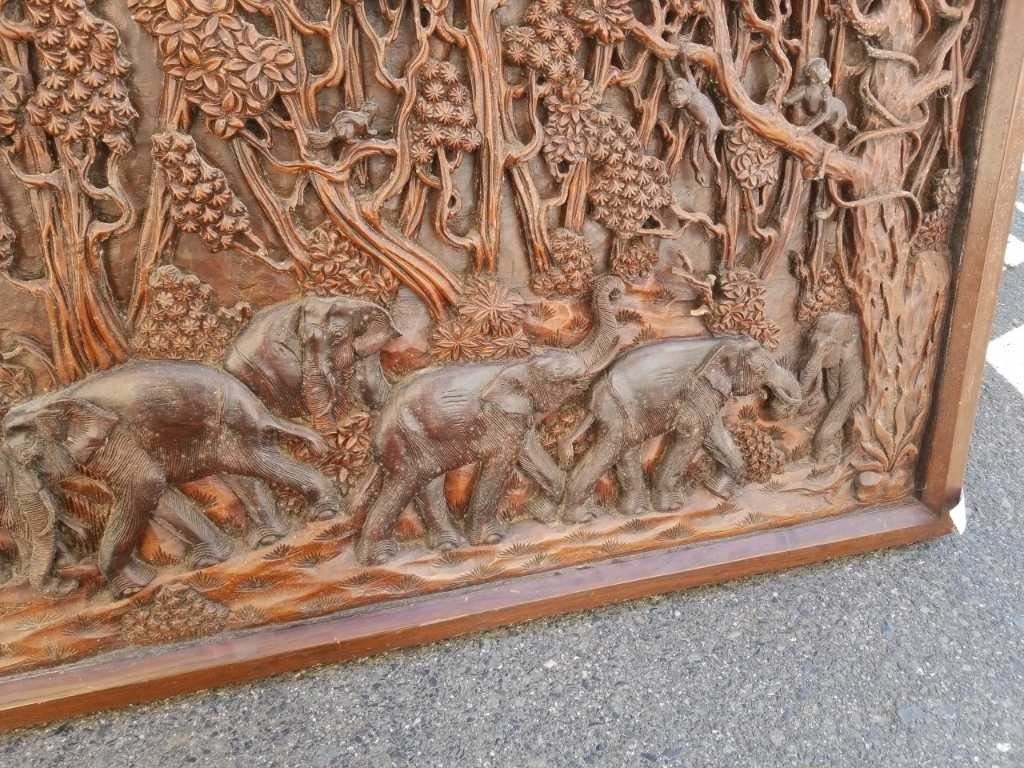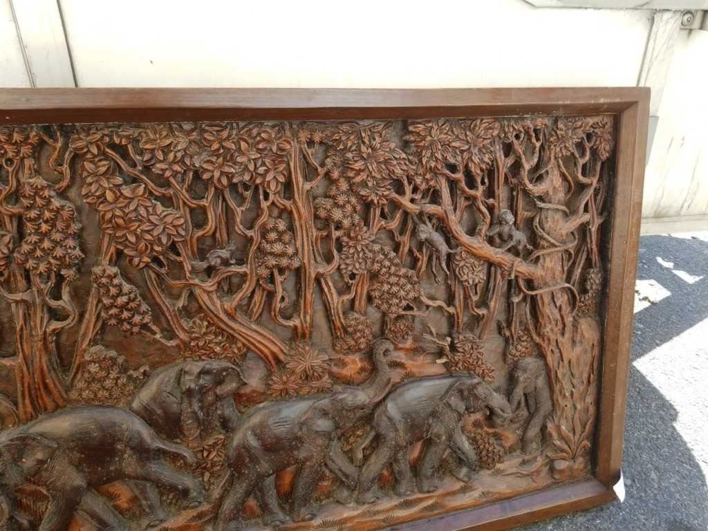 LARGE CARVED JUNGLE WALL ART - 59 X 27 INCHES , ELEPHANTS, MONKEYS, TIGER, TREES