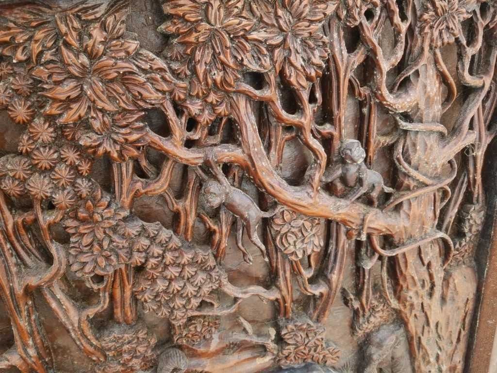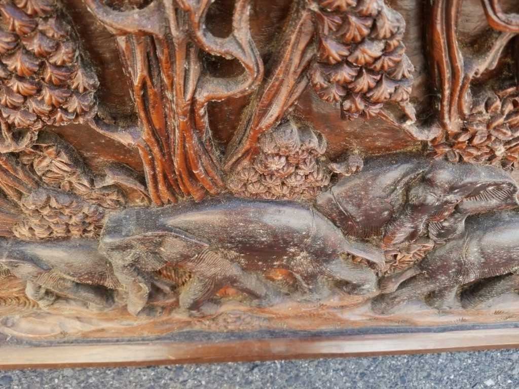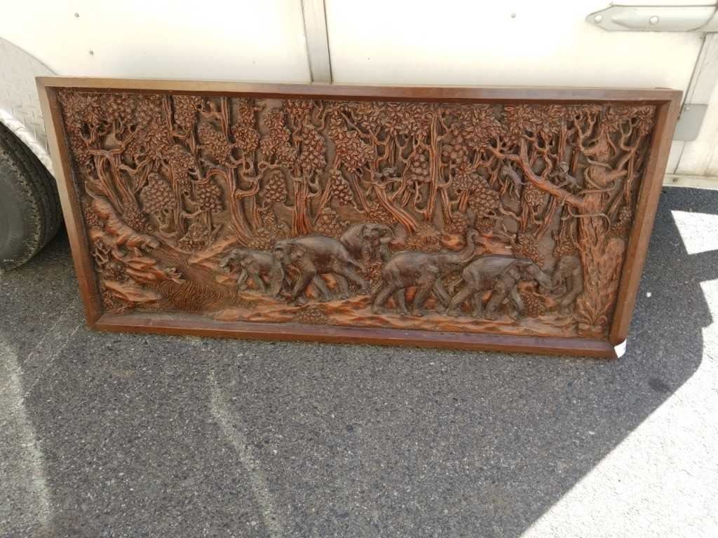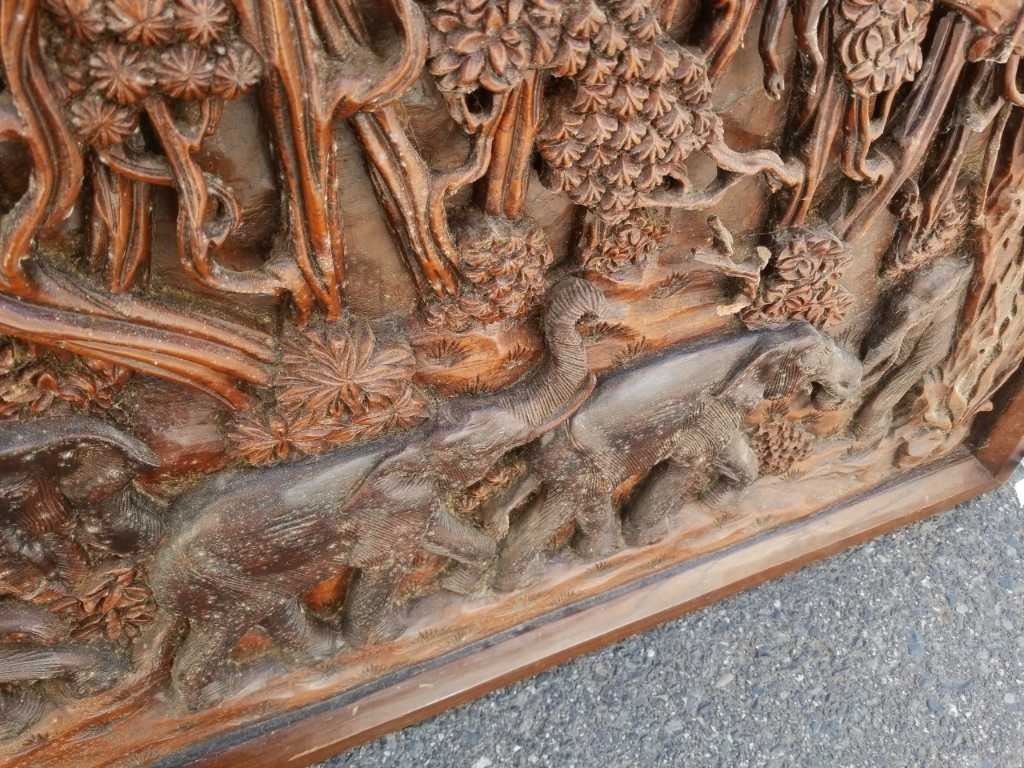 LARGE CARVED JUNGLE WALL ART - 59 X 27 INCHES , ELEPHANTS, MONKEYS, TIGER, TREES
