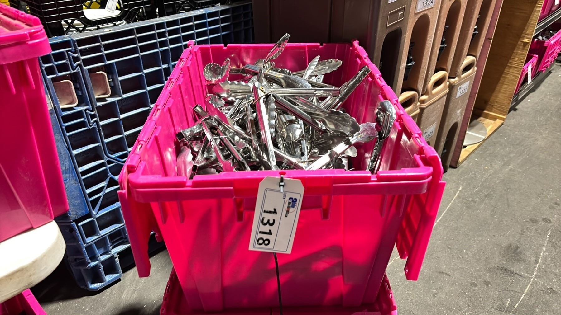 LARGE FOLD TOP BIN OF COMMERCIAL RESTAURANT CHROME ASSORTED BBQ TONGS *BIN INCLUDED*