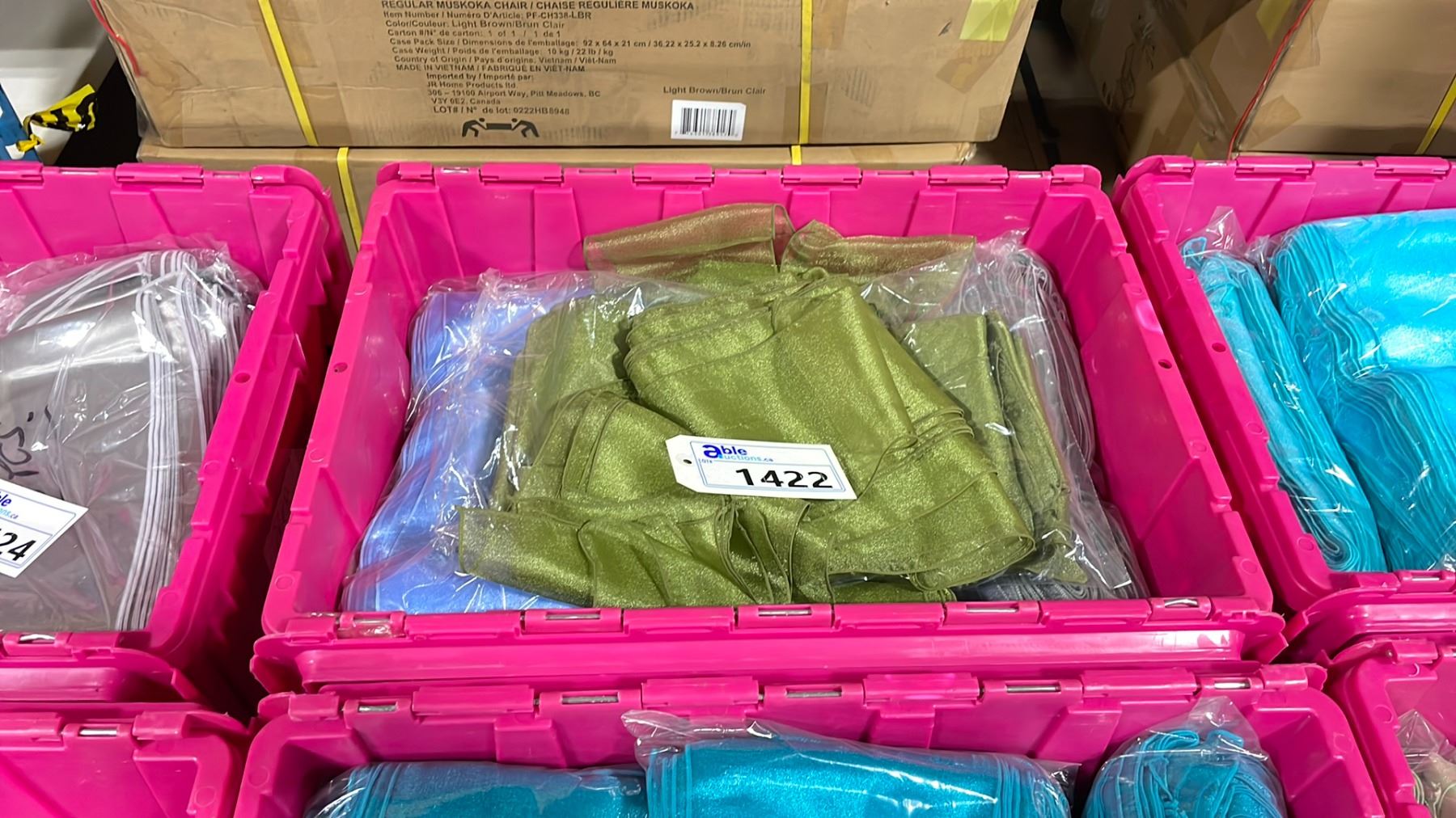 LARGE FOLD TOP BIN OF EVENT/ BANQUET CHAIR ORGANZA FABRIC ( LAVENDER, GREY, GREEN ) *BIN INCLUDED*