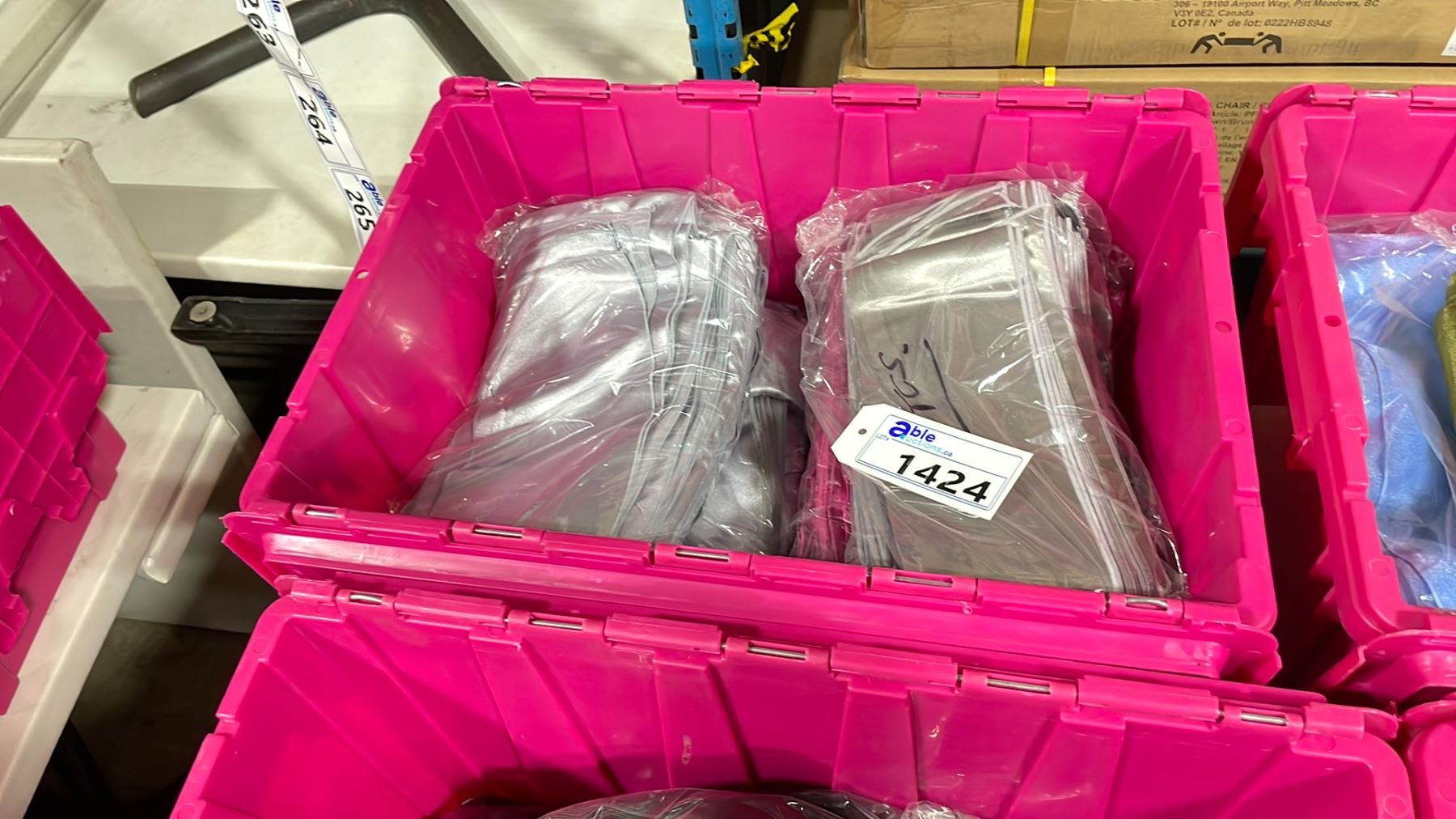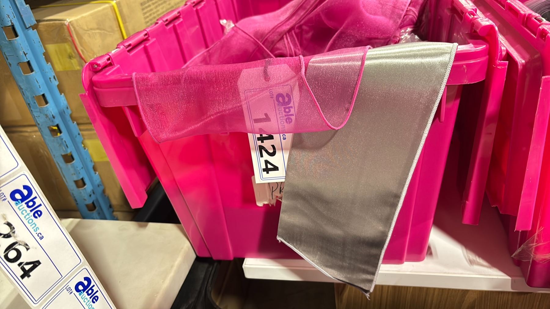 LARGE FOLD TOP BIN OF EVENT/ BANQUET CHAIR ORGANZA FABRIC ( SILVER, PINK ) *BIN INCLUDED*