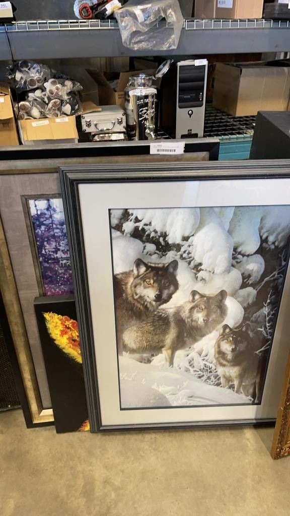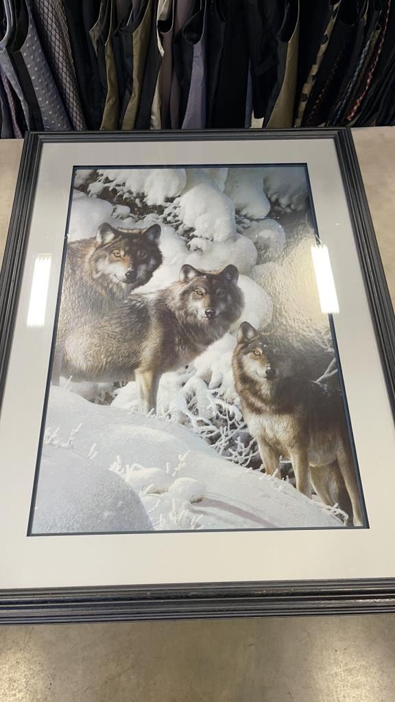 LARGE FRAMED WOLF PRINT AND 2 OTHER PRINTS