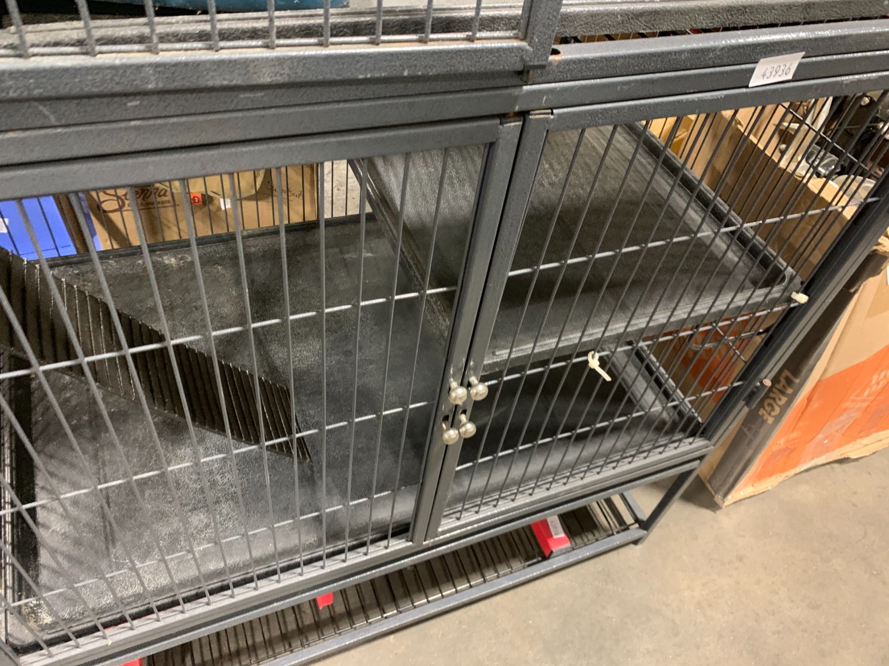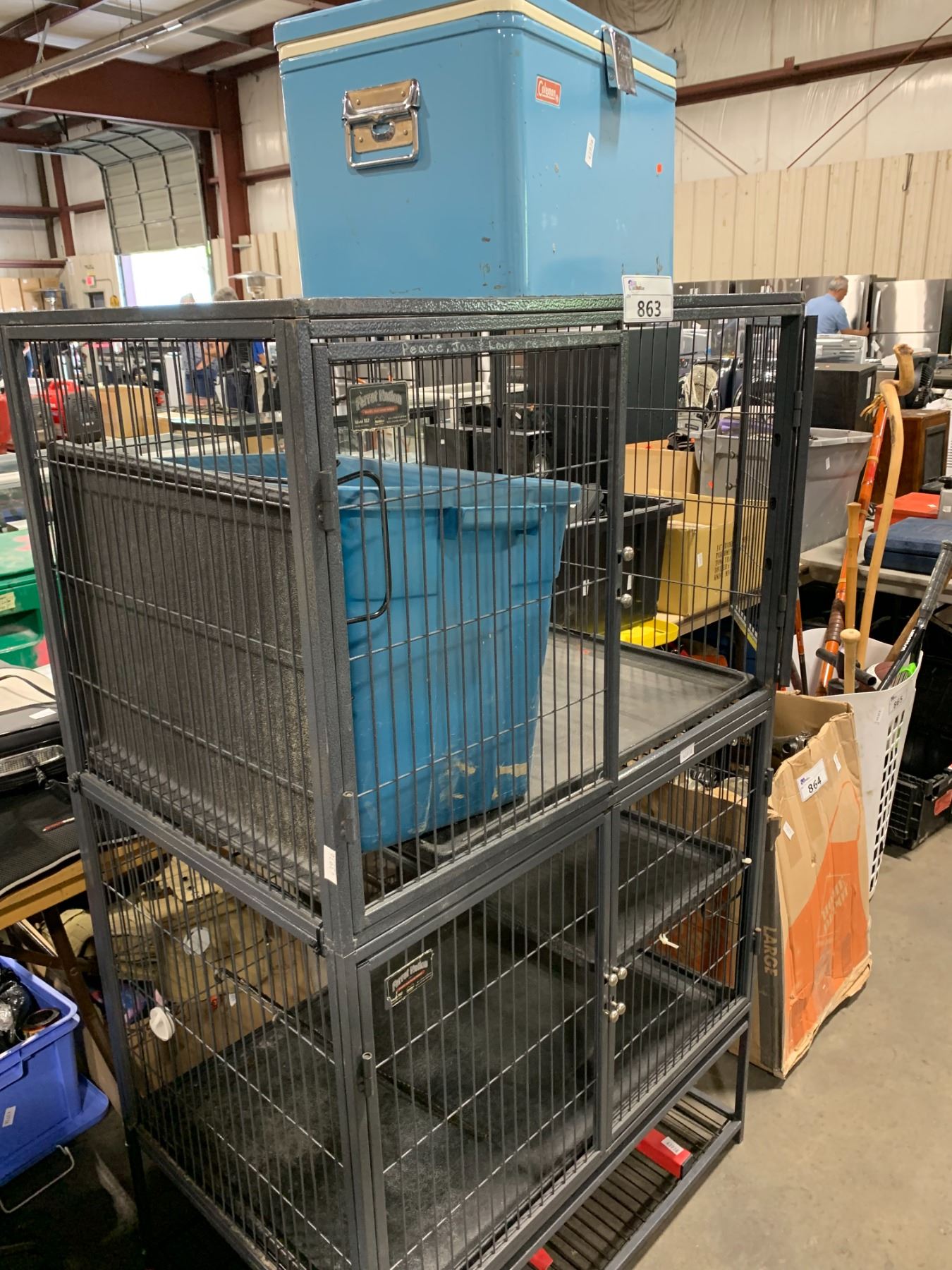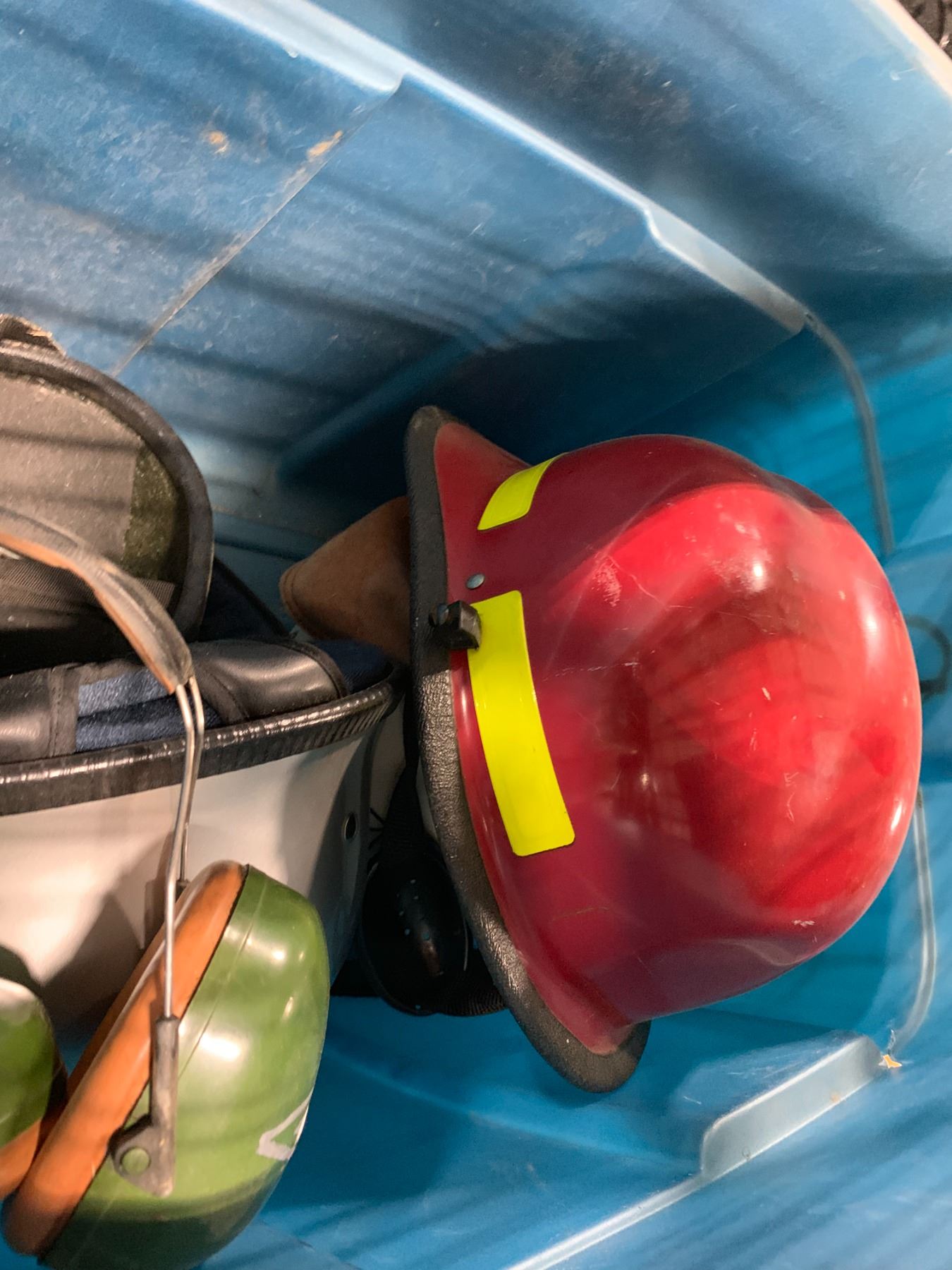 LARGE GREY METAL FERRET NATION FERRET CAGE, COLEMAN COOLER & BIN WITH HELMETS / HARD HATS