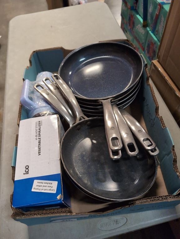 LARGE LOT OF FRYING PANS AND OTHER KITCHEN ITEMS.