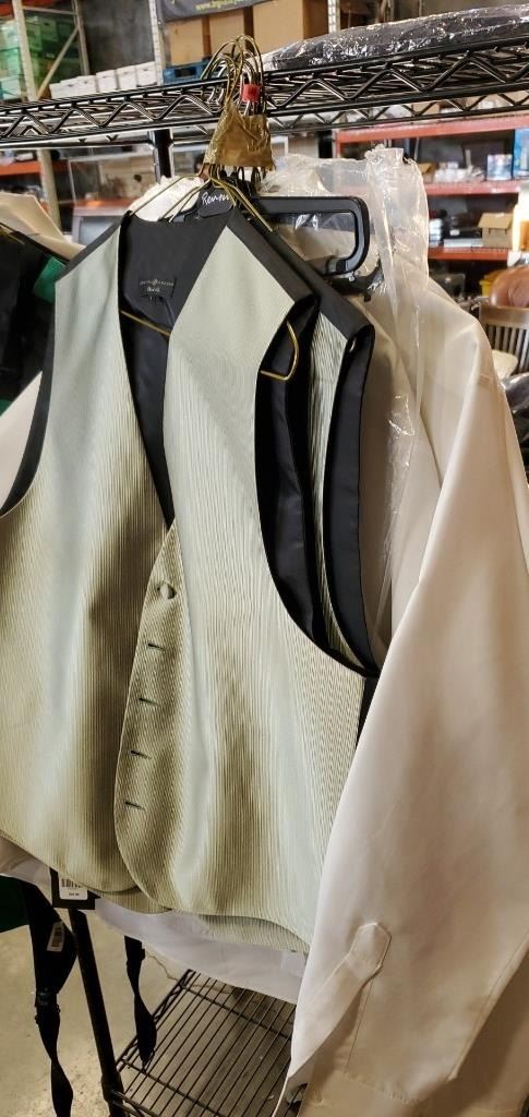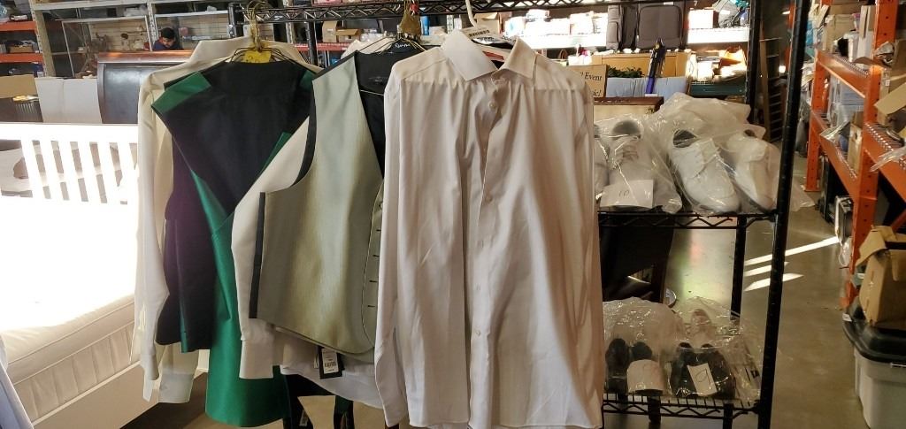LARGE LOT OF MENS FORMAL WEAR - SHIRTS, VESTS, SHOES, KIDS DRESS SHOES, ETC