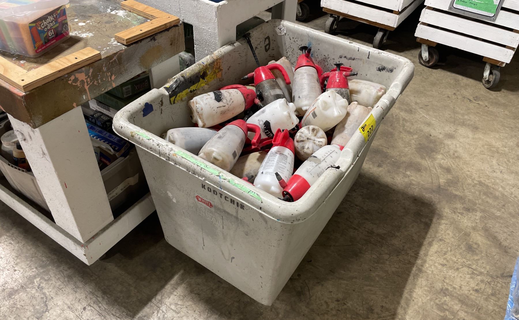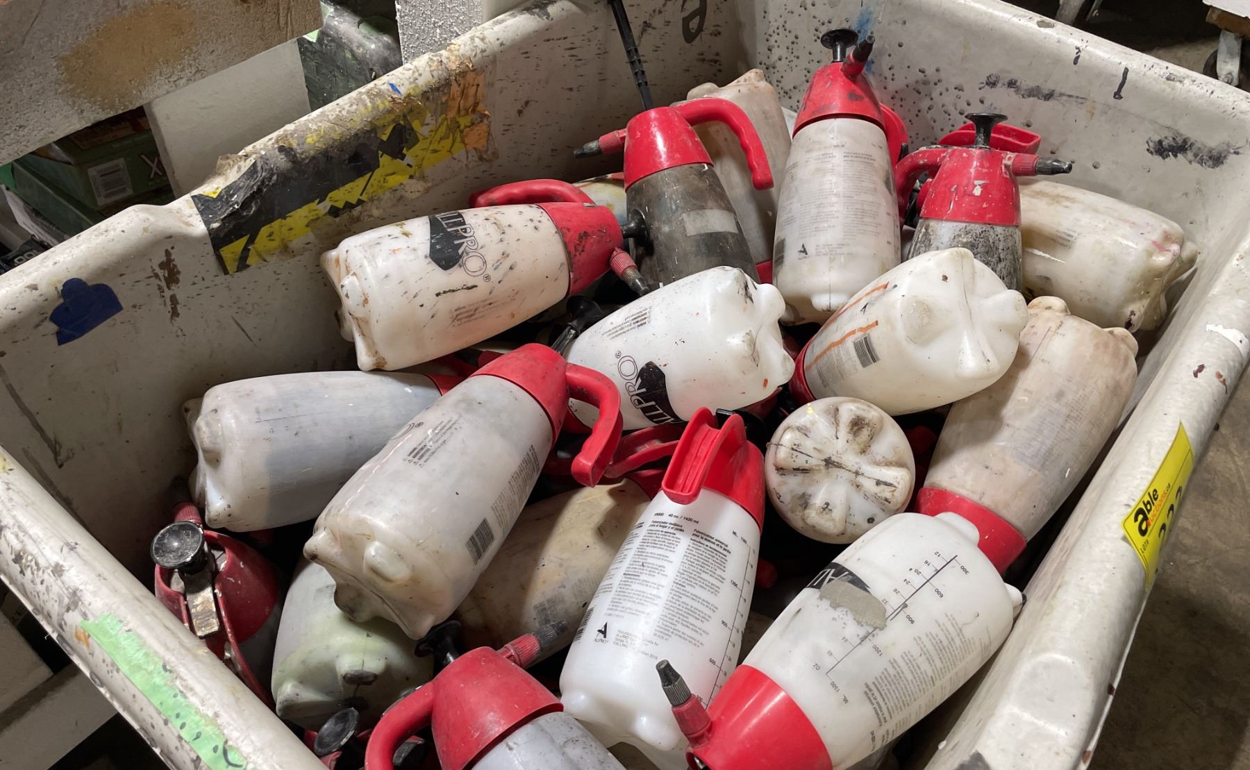 LARGE MOBILE BIN OF ASSORTED INDUSTRIAL HAND HELD CHEMICAL SPRAYERS *BIN INCLUDED*