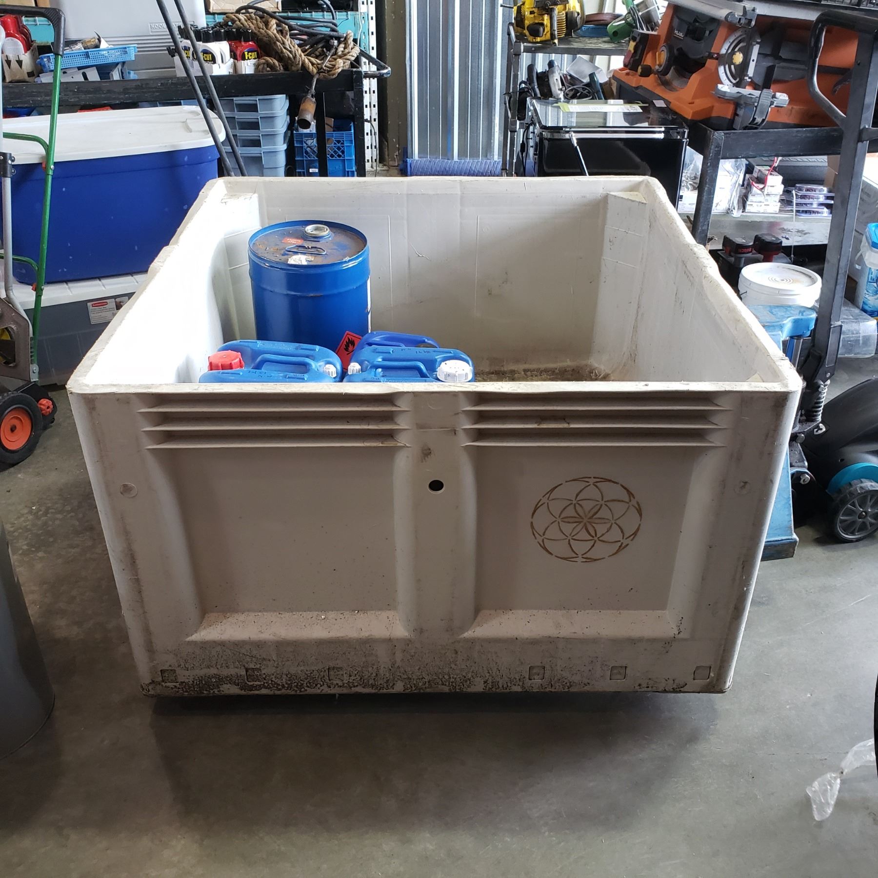 LARGE PLASTIC BIN 5FT BY 5FT W/ PLASTIC CONTAINERS