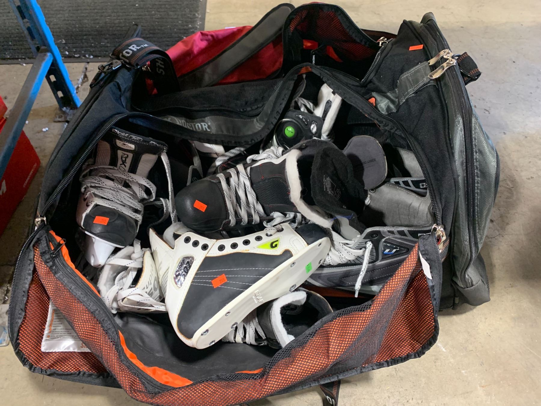 LARGE SHOCK DOCTOR EQUIPMENT BAG FILLED WITH VARIOUS SIZE SKATES WITH & WITHOUT BLADES