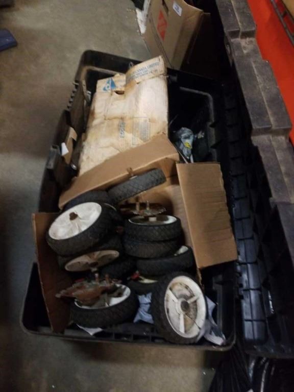 LARGE TOTE OF KART WHEELS AND SHOP SUPPLIES