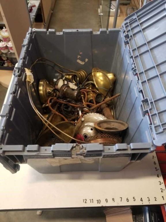 LARGE TOTE OF VINTAGE LAMP PARTS AND HARDWARE
