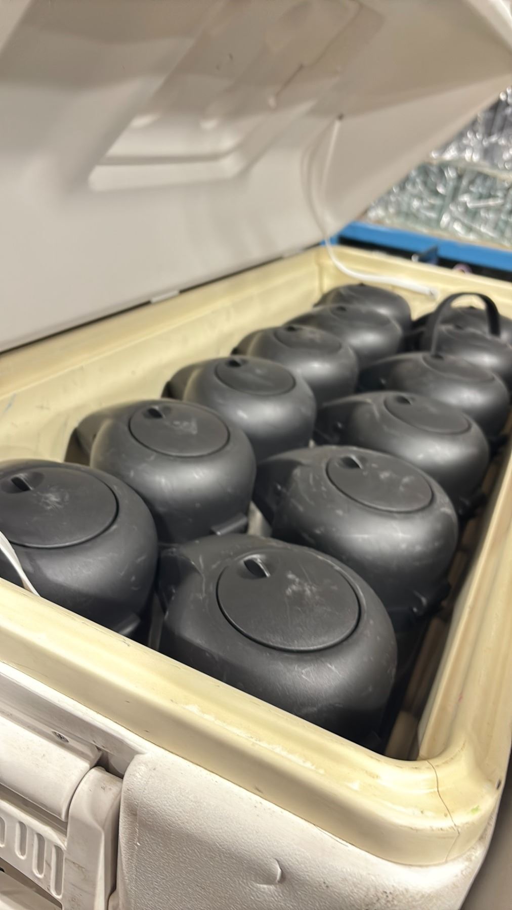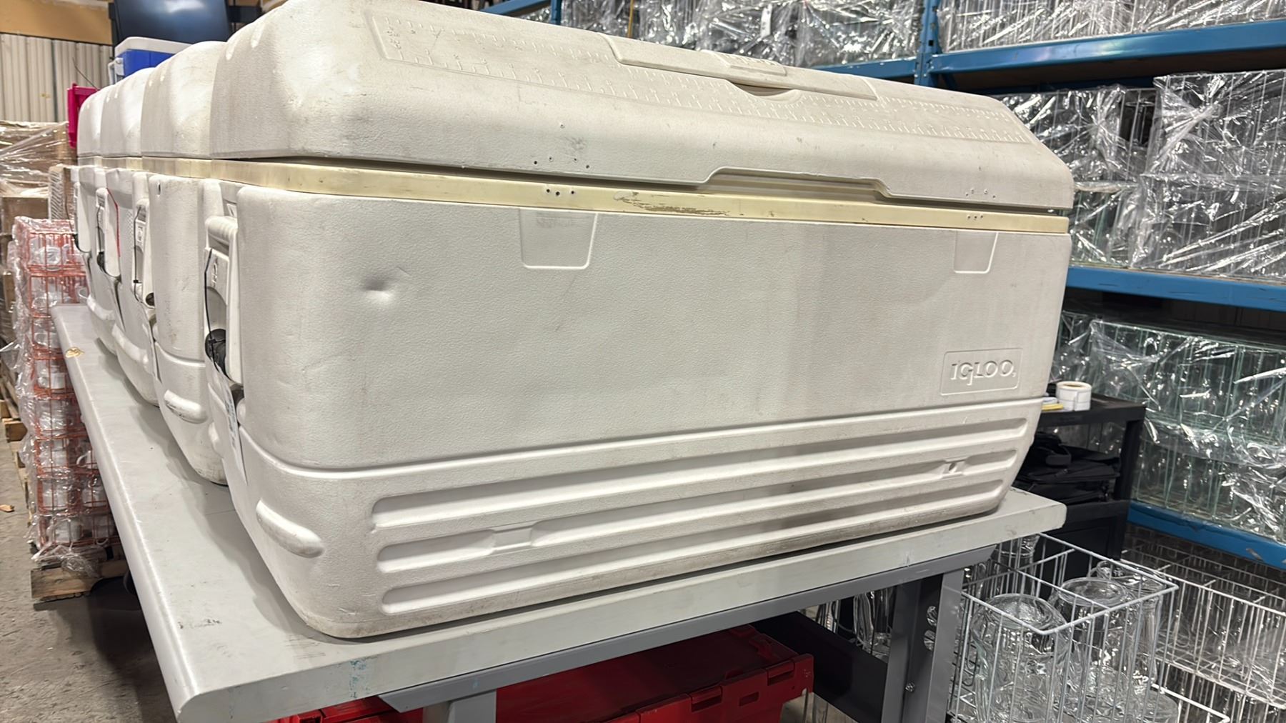 LARGE WHITE 40"L IGLOO INSULATED COOLER W/ MULTIPLE COFFEE CARAFES INSIDE