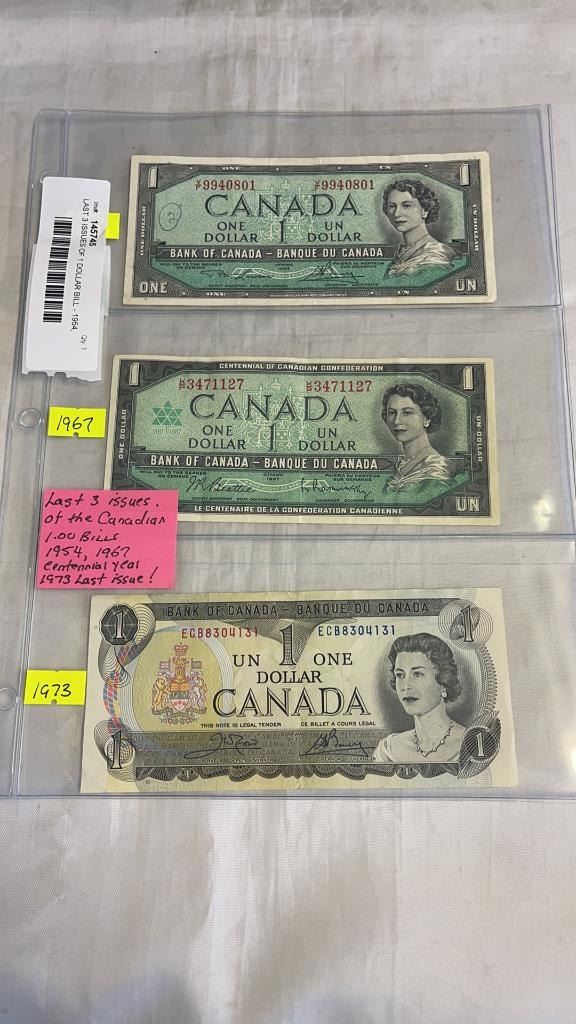 LAST 3 ISSUES OF 1 DOLLAR BILL - 1954, 1967, 1973