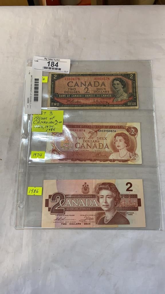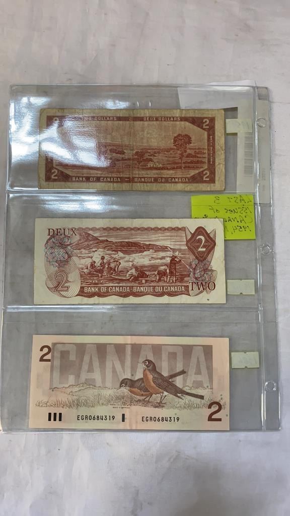 LAST 3 ISSUES OF CANADIAN 2 DOLLAR BILLS 1954, 1974, 1986