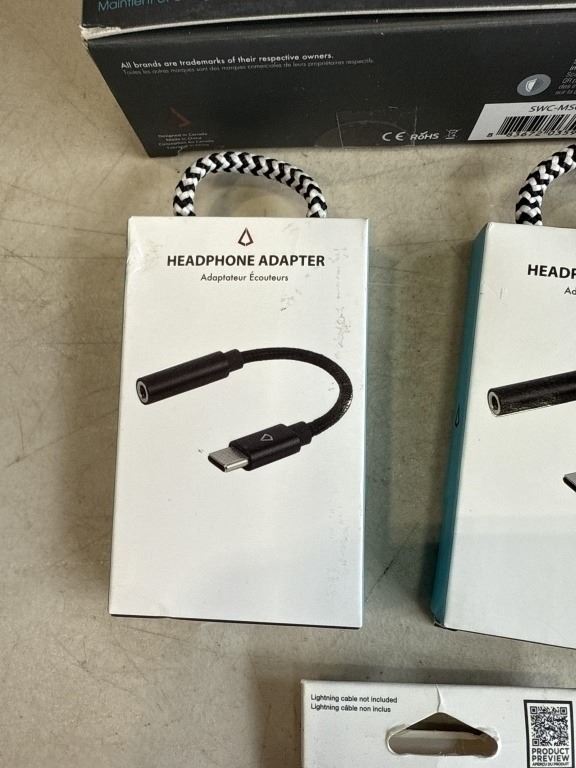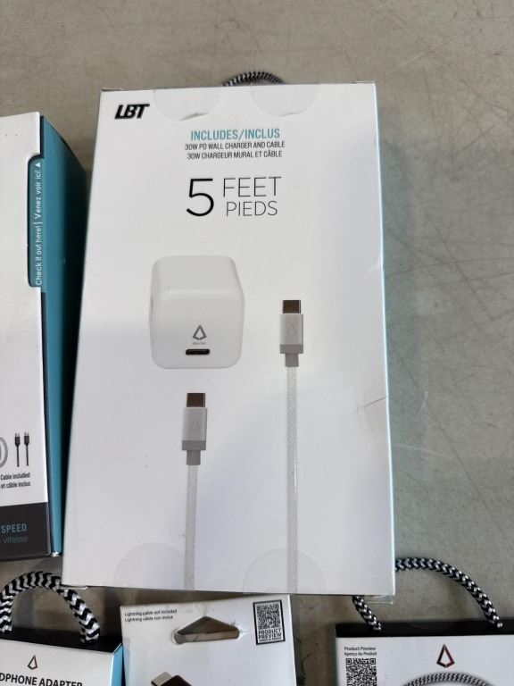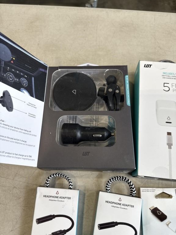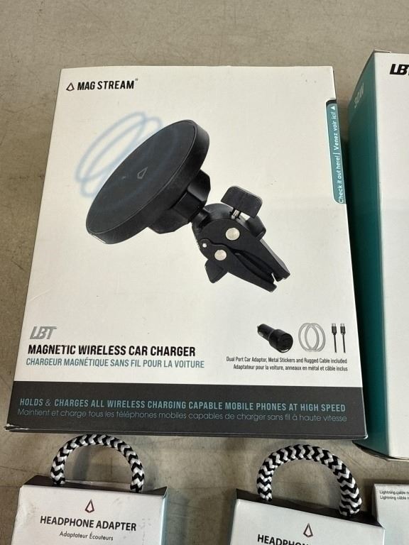 LBT MAGNETIC WIRELESS CAR CHARGER, 30W WALL CHARGER, HEADPHONE ADAPTERS, USB CABLE AND ADAPTERS