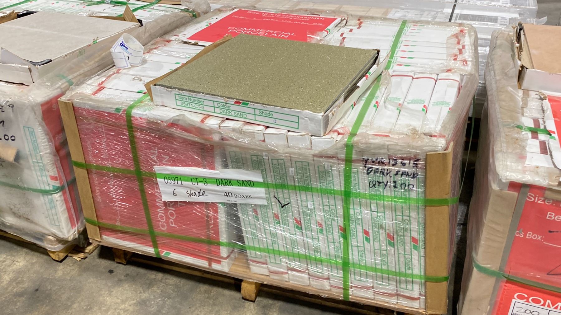 *LD* 432SQ FT OF DARK SAND 18"X18" COMMERCIAL PORCELAIN FLOOR TILE 10.8SQ FT, 5 PCS PER BOX, 1.012 SQ METERS PER BOX 40 BOXES, 432 SQ FT TOTAL *MUST TAKE ALL ON PALLET* LOCATED IN SURREY, MONDAY/TUESDAY PICKUP