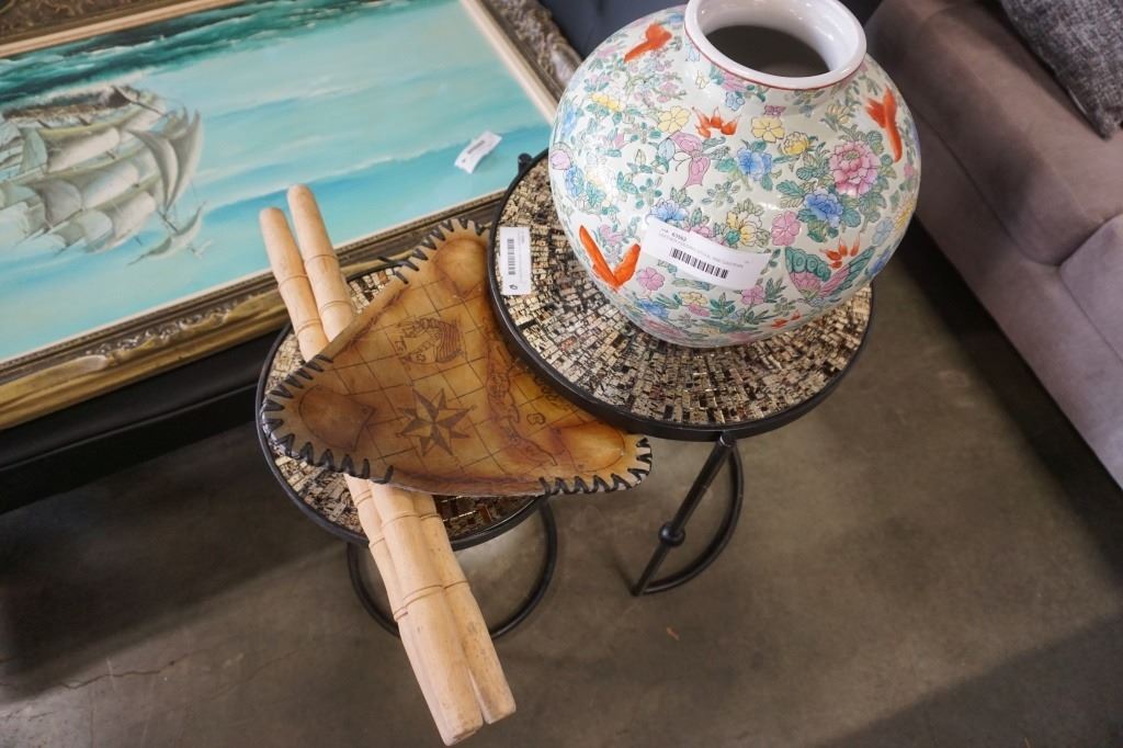 LEATHER FOLDING STOOL AND EASTERN VASE