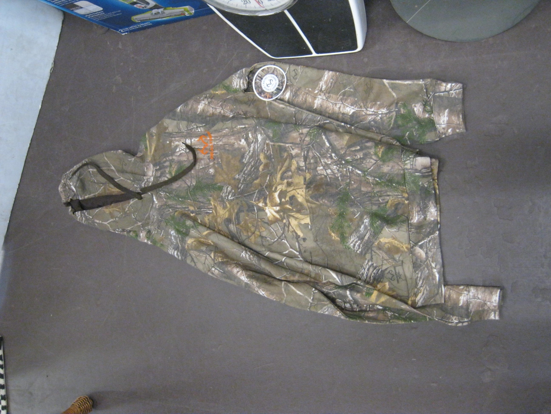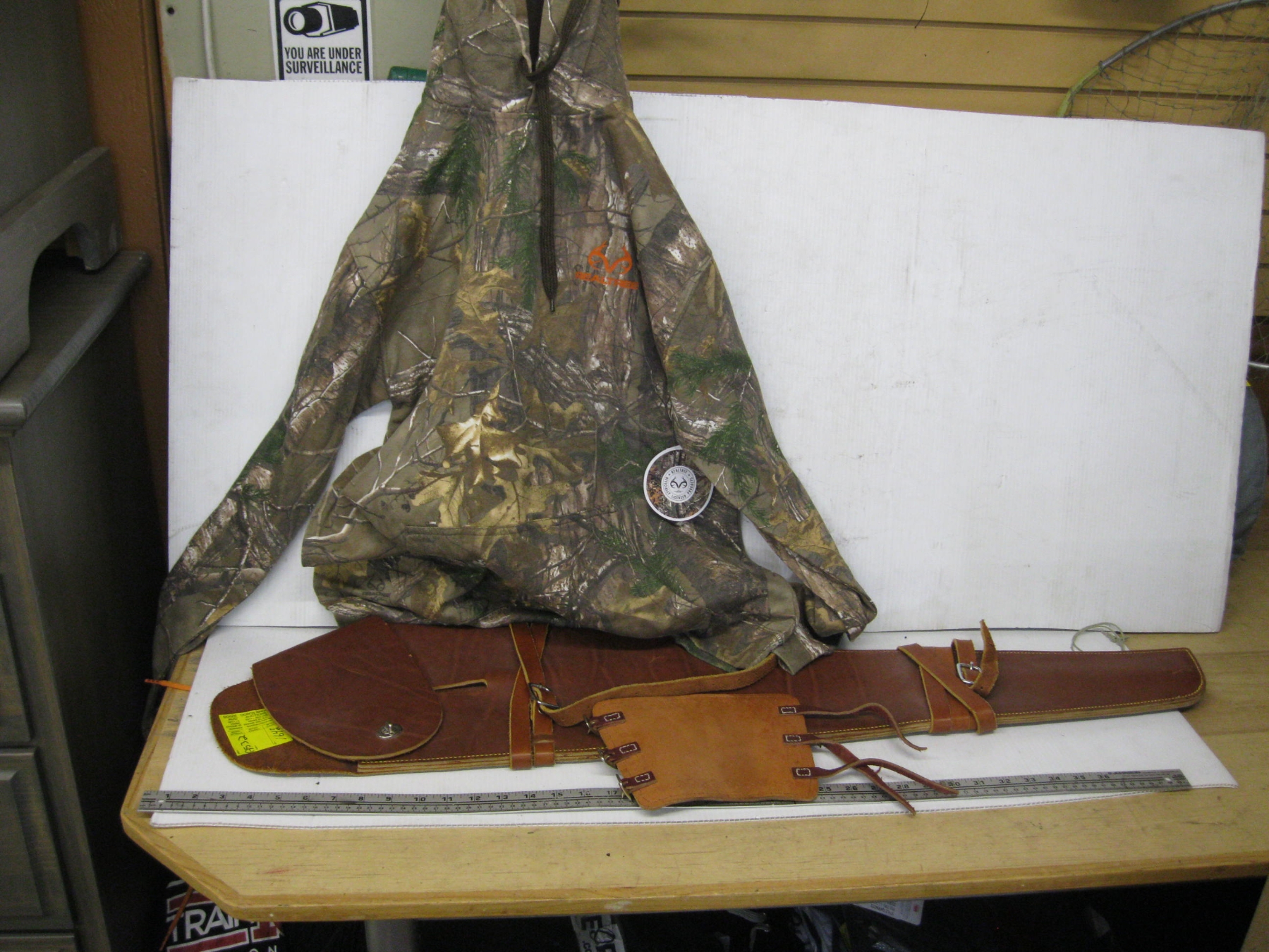LEATHER GUN SCABBARD & A NEW W/TAGS CAMMO REALTREE SZ L HOODIE