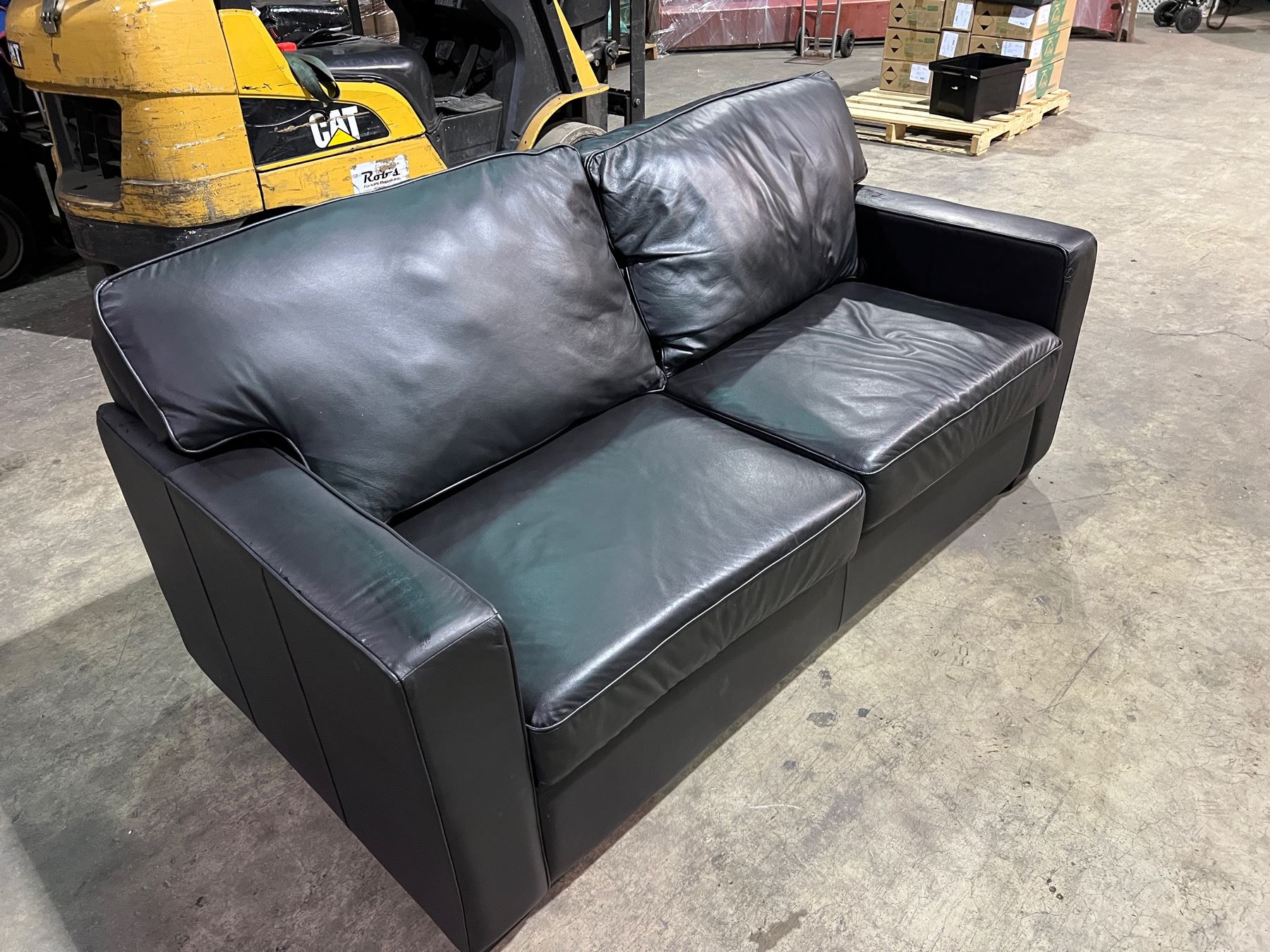 LEATHER LOVESEAT HIDEABED, QUEEN SIZE MATTRESS (SLIGHTLY USED)