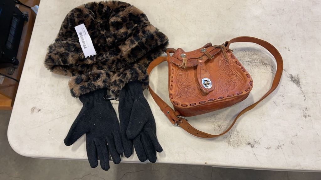 LEATHER PURSE WITH GERELDO HAT GLOVES, MINI ROOM DIVIDER AND JAR, PITCHER AND JUICERS