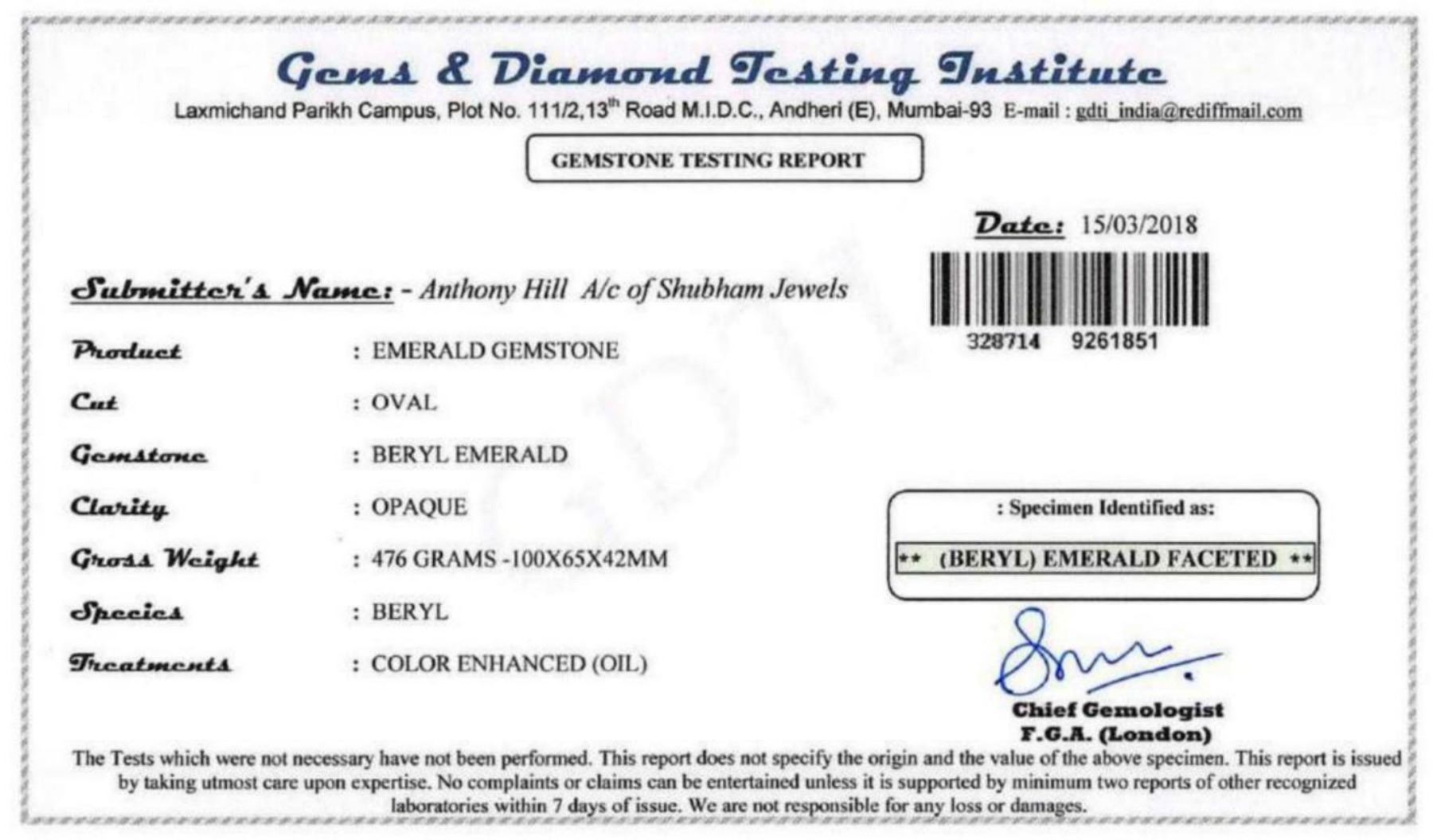 LEGENDARY RARE 2400 CT CERTIFIED MUSEUM SIZE EMERALD. OVAL CUT MEASURING 100 x 65 x 42 mm. PLEASE SEE CERTIFICATIONS FOR FURTHER DETAILS. ONE OF A KIND SHOW PIECE . TOTAL GRAMWT APPROX: 476