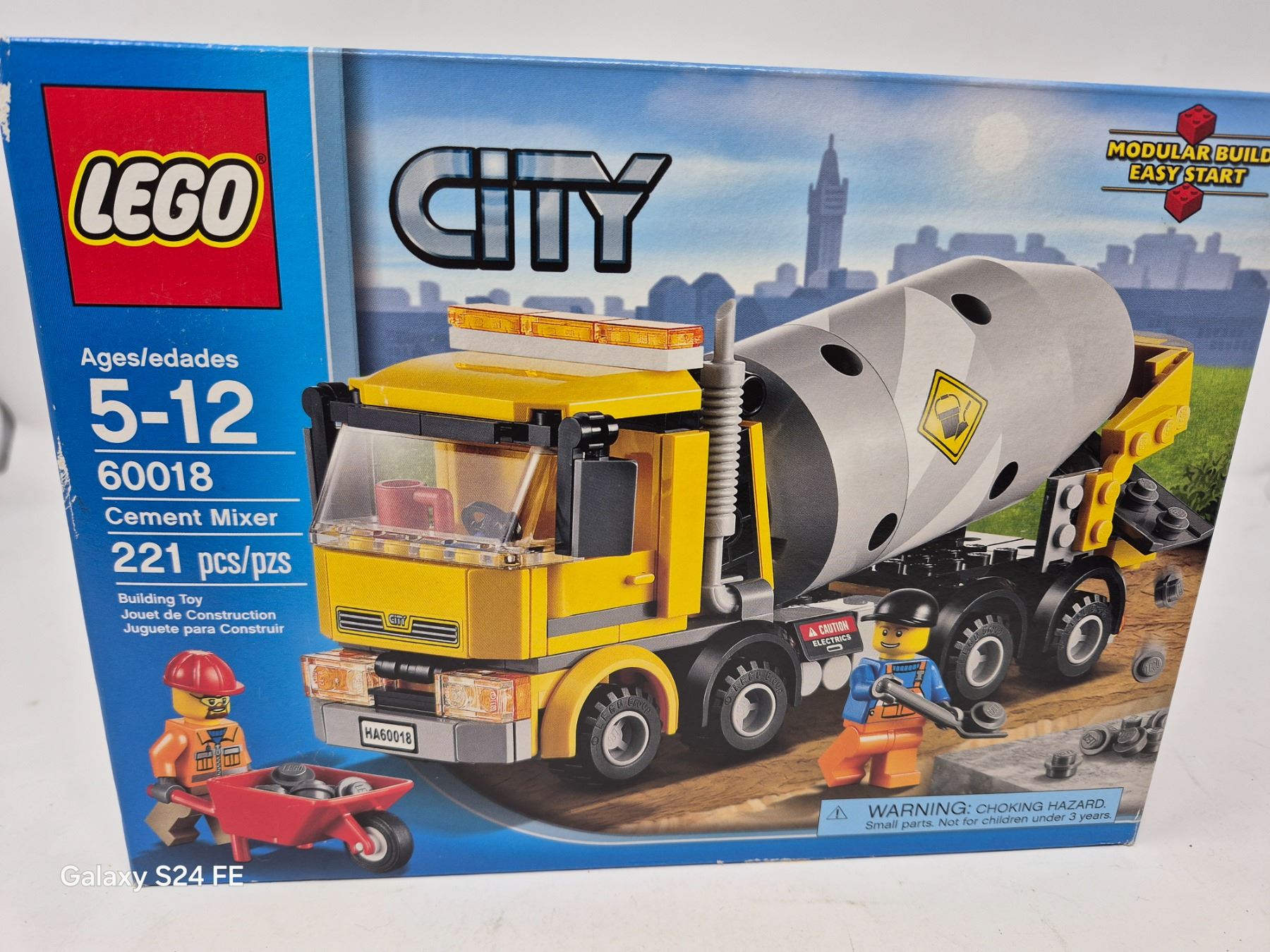Brand new LEGO City 60018 Cement Mixer set. Includes 221 pieces and minifigures. Great for ages 5–12. Box in excellent condition.