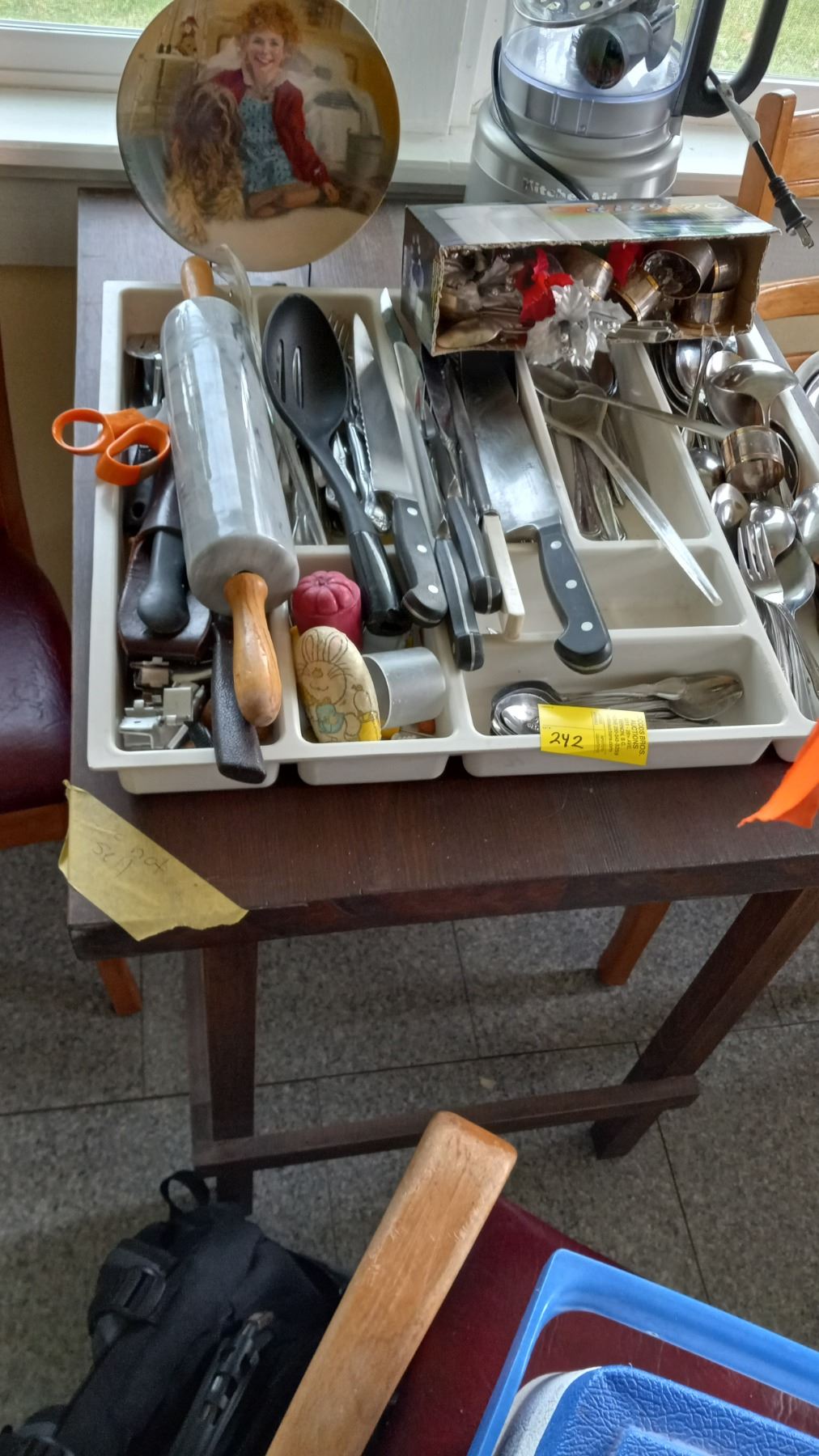 LG. CUTLERY TRAY W/ASST. CUTLERY, UTENSILS, ROLLING PIN, ETC.