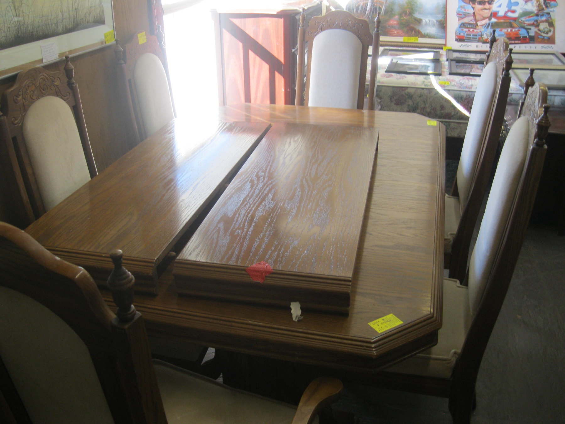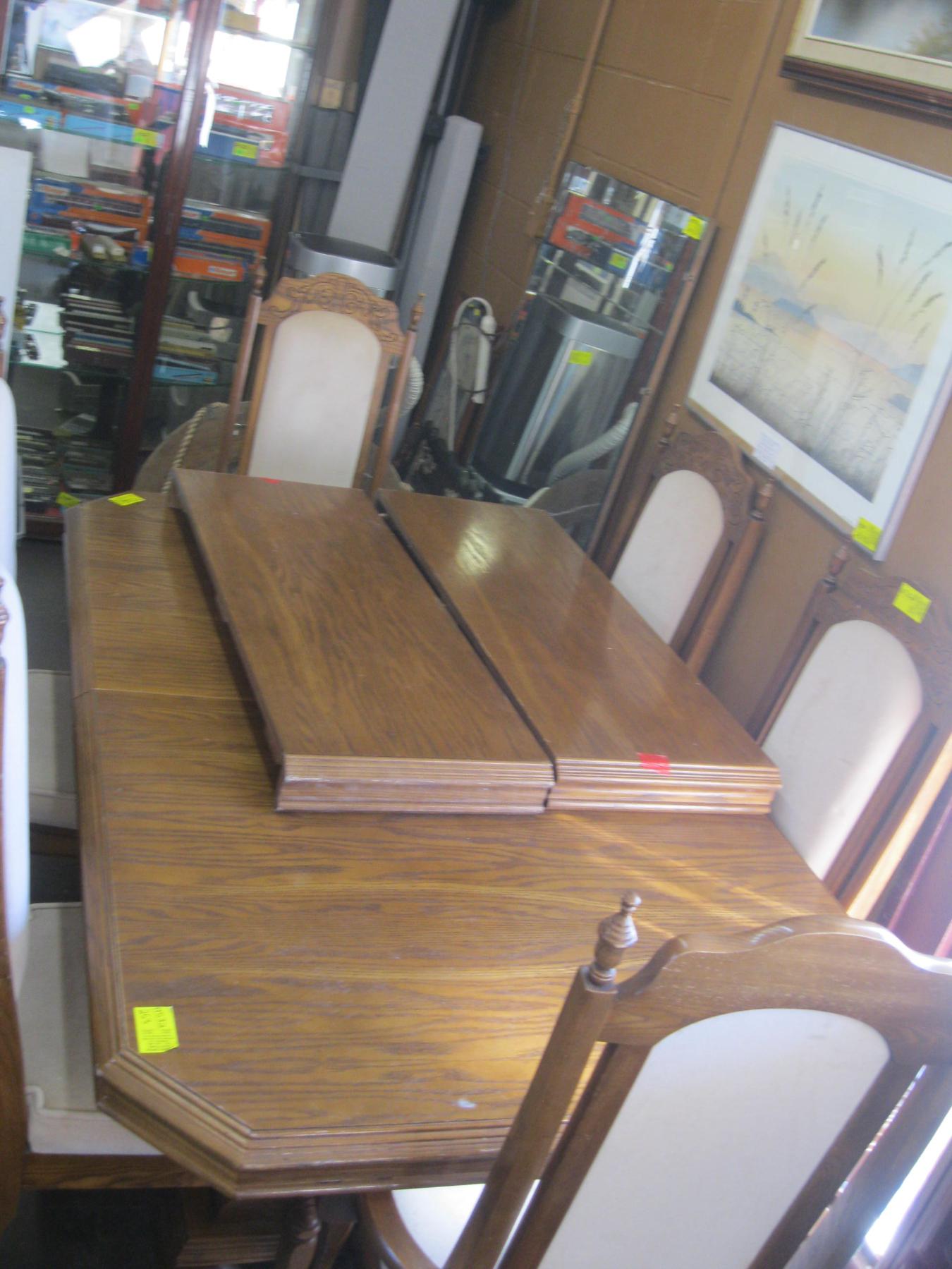 LG. DINING TABLE W/2 LEAFS & 6 WOOD & UPHOLSTERED CHAIRS