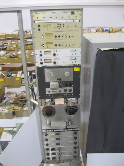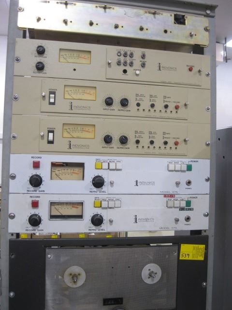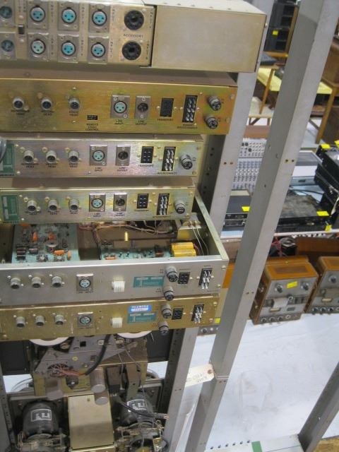 LG. METAL RACK WITH ASST. COMPONENTS, INCLUDING 2 AMPEX REEL TO REELS, 7 AMPEX COMPONENTS, 2 INNOVONIX MODEL 75s & 2 INNOVONIX MODEL 370 & 1 INNOVONIX MODEL 380