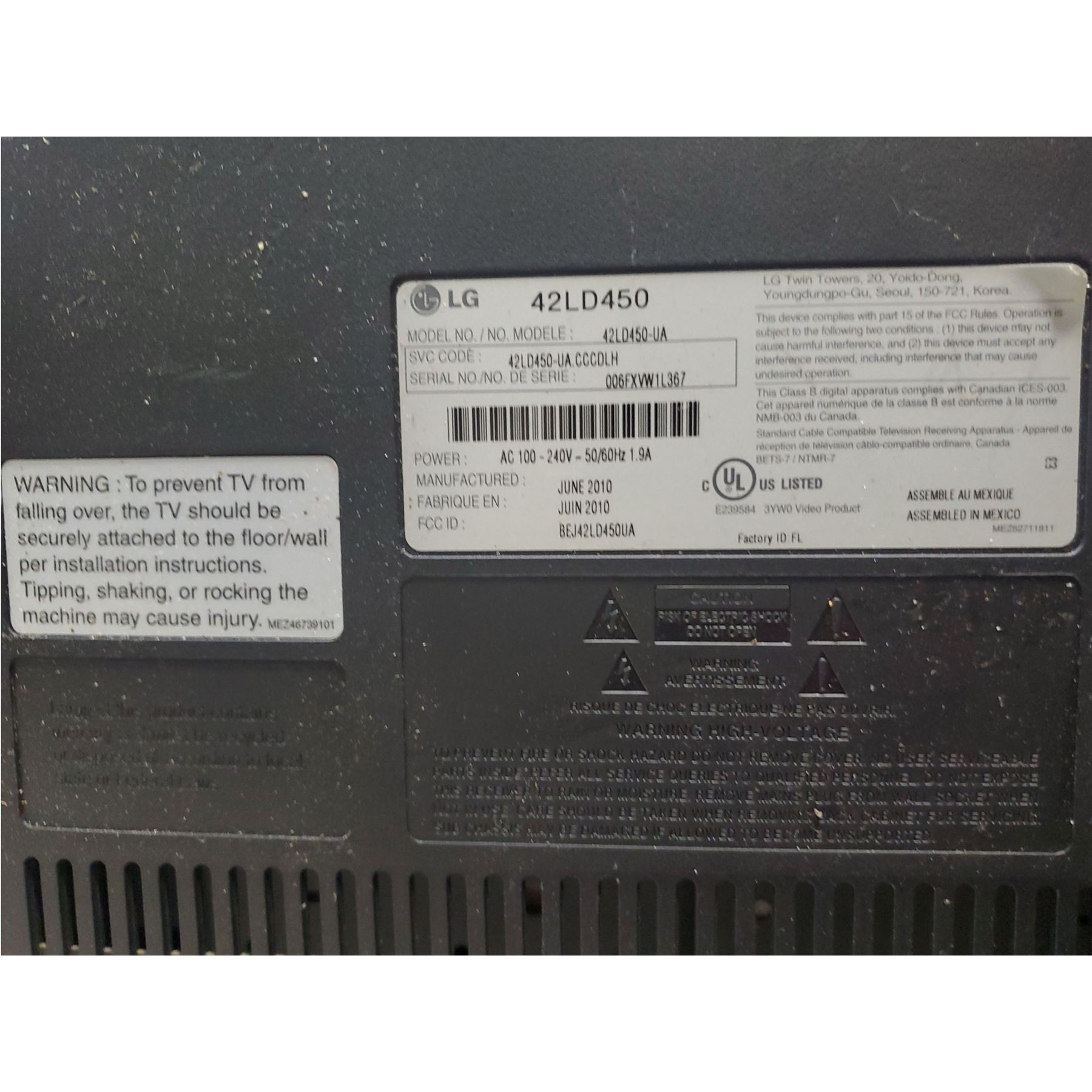 LG TV Model No: 42LD450-UA - No Wires