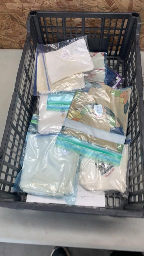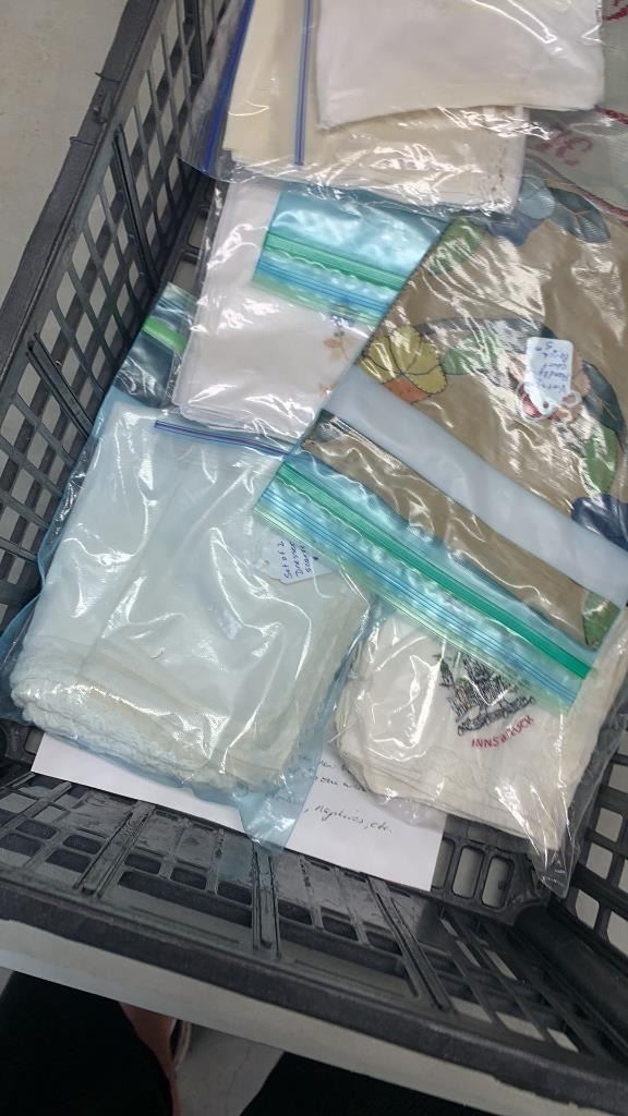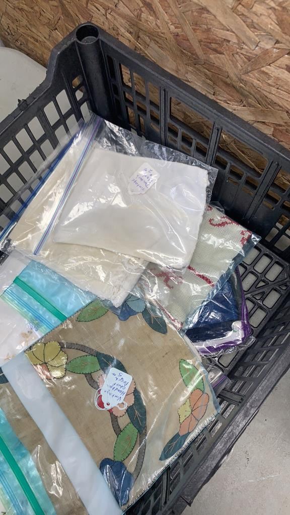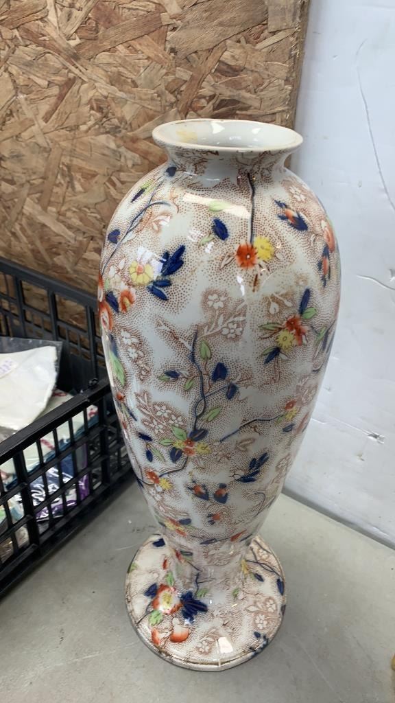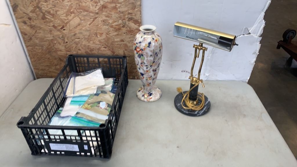 LIBRARY LAMP WITH MARBLE BASE, HANCOCK ROSELLA VASE, ROYAL CORONA WARE WITH VINTAGE DOILIES, NAPKINS ETC