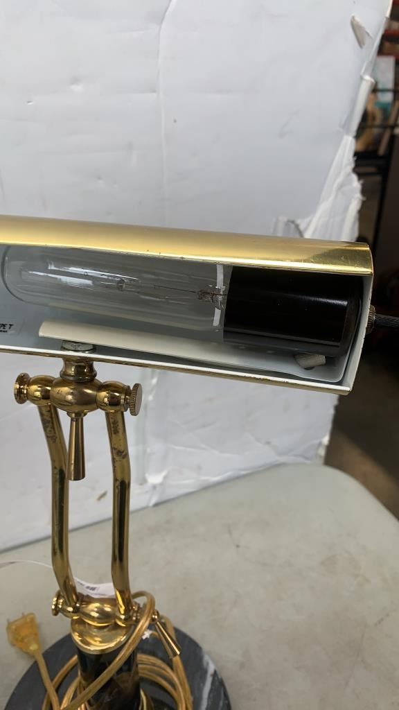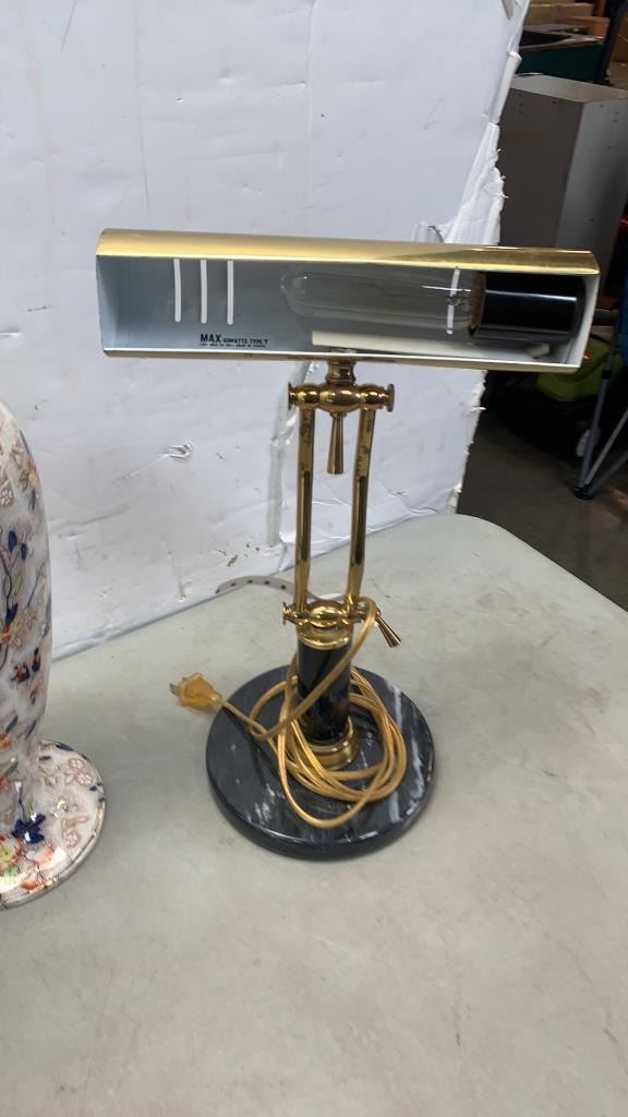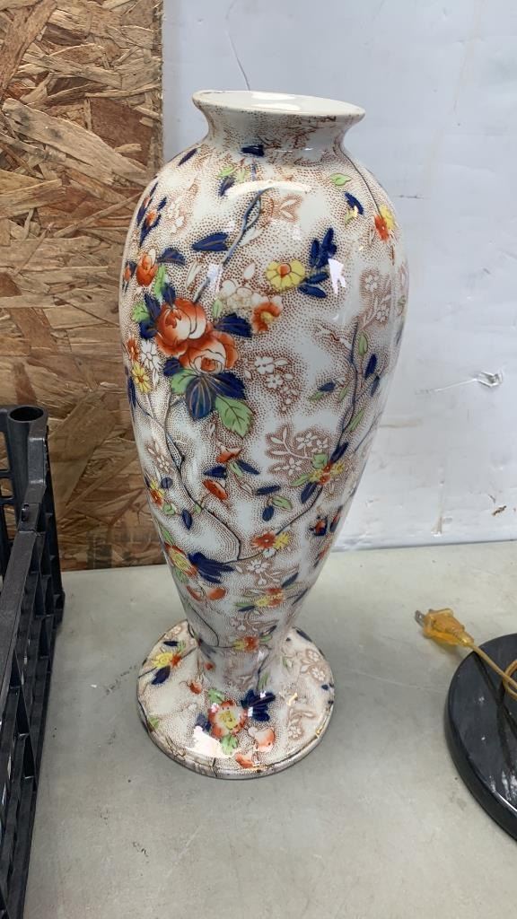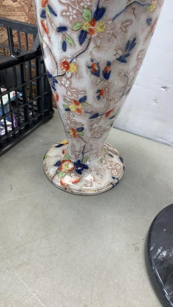 LIBRARY LAMP WITH MARBLE BASE, HANCOCK ROSELLA VASE, ROYAL CORONA WARE WITH VINTAGE DOILIES, NAPKINS