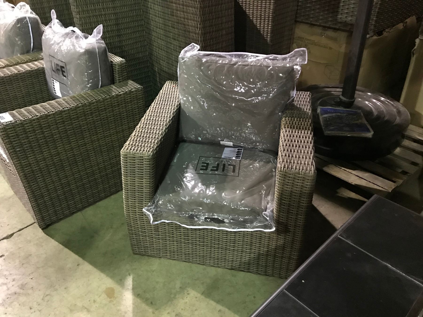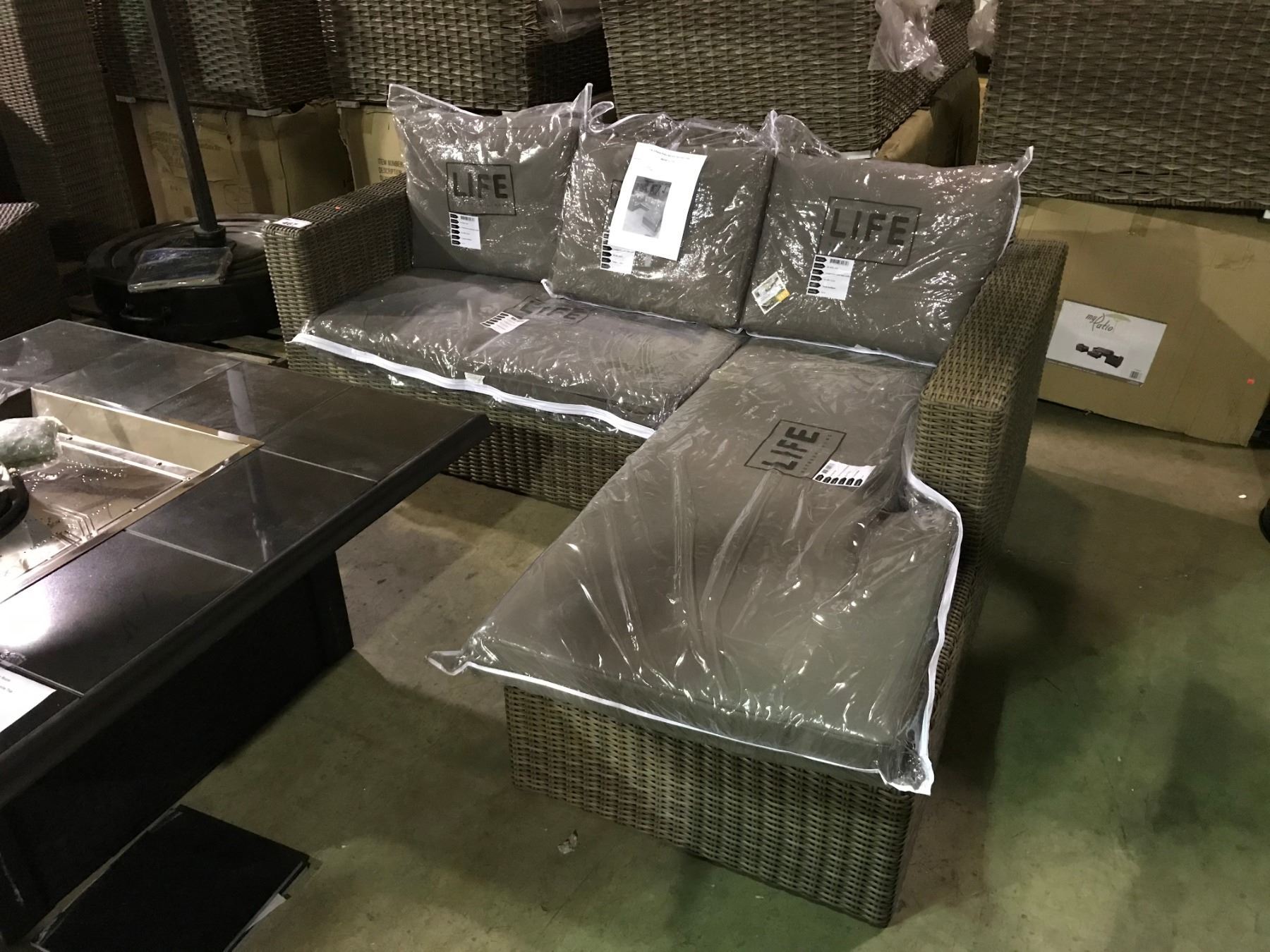 LIFE 3 PCS PLASTIC RATTAN OUTDOOR SECTIONAL SET WITH BROWN CUSHIONS INCLUDING: 3 SEAT SOFA LOUNGER & RECLINING ARM CHAIR SOFA - 79" X 66", CHAIR - 34" X 32"