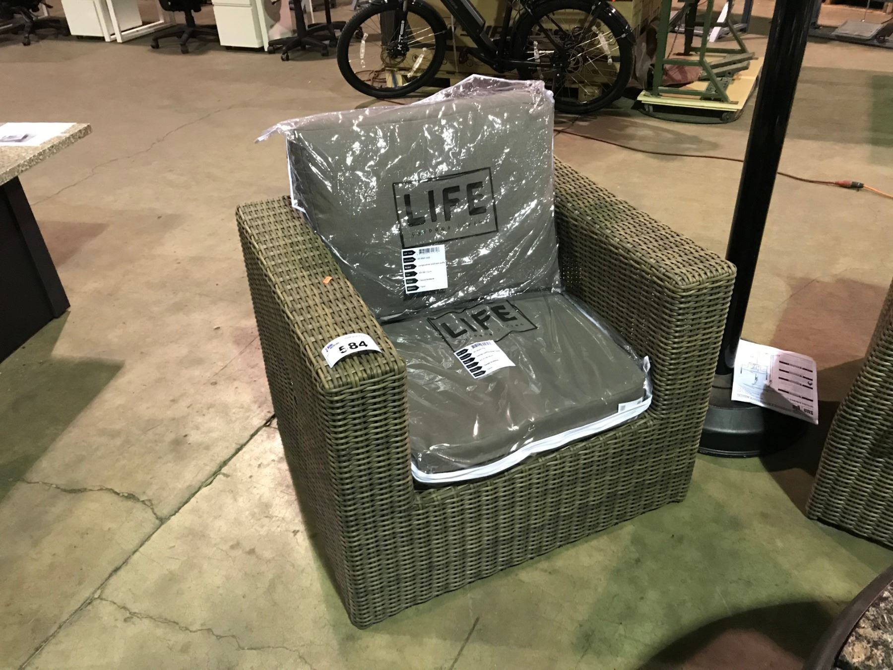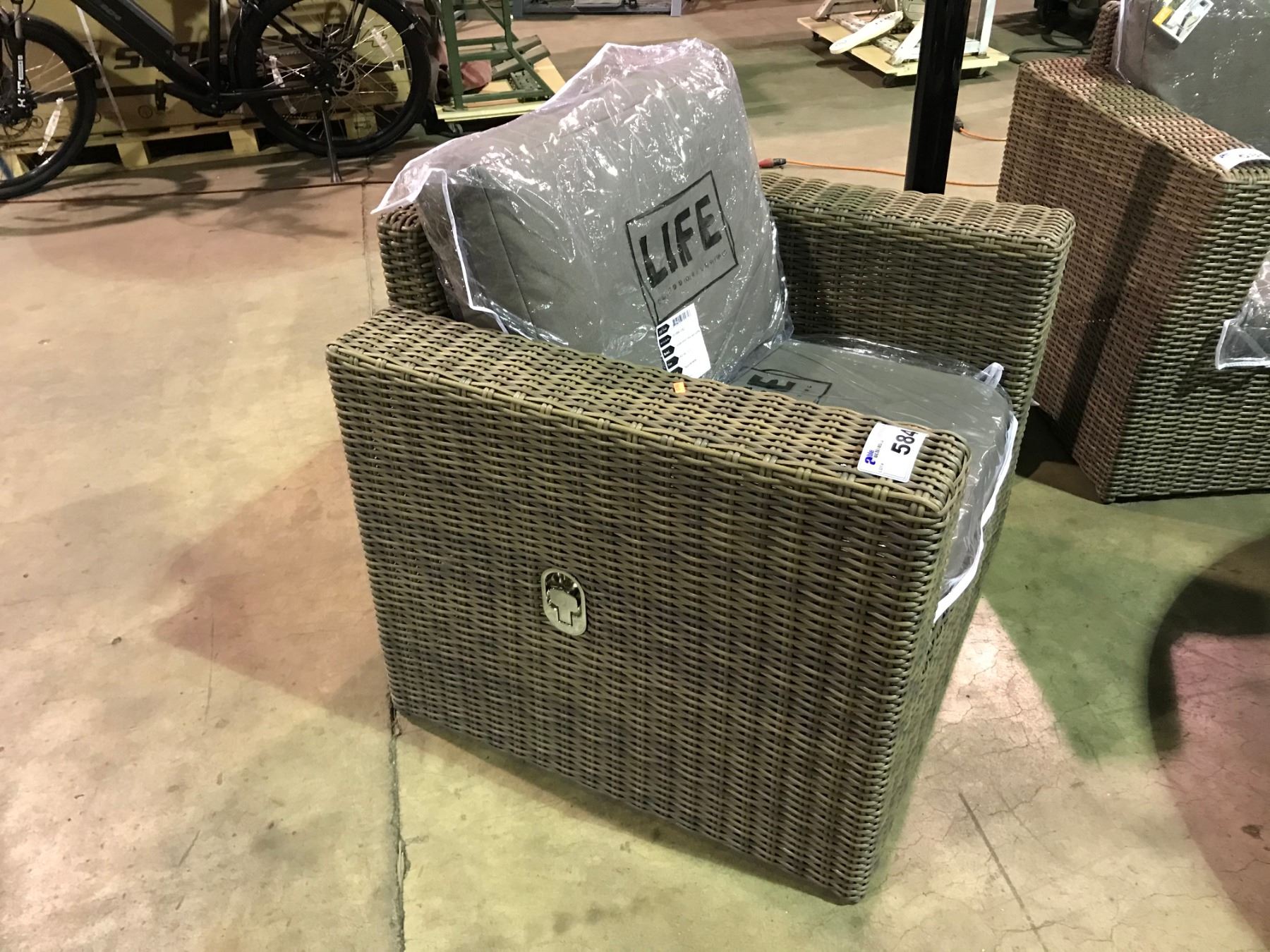 LIFE PLASTIC RATTAN OUTDOOR RECLINING ARM WITH BROWN CUSHIONS MSRP $900 34" X 32"