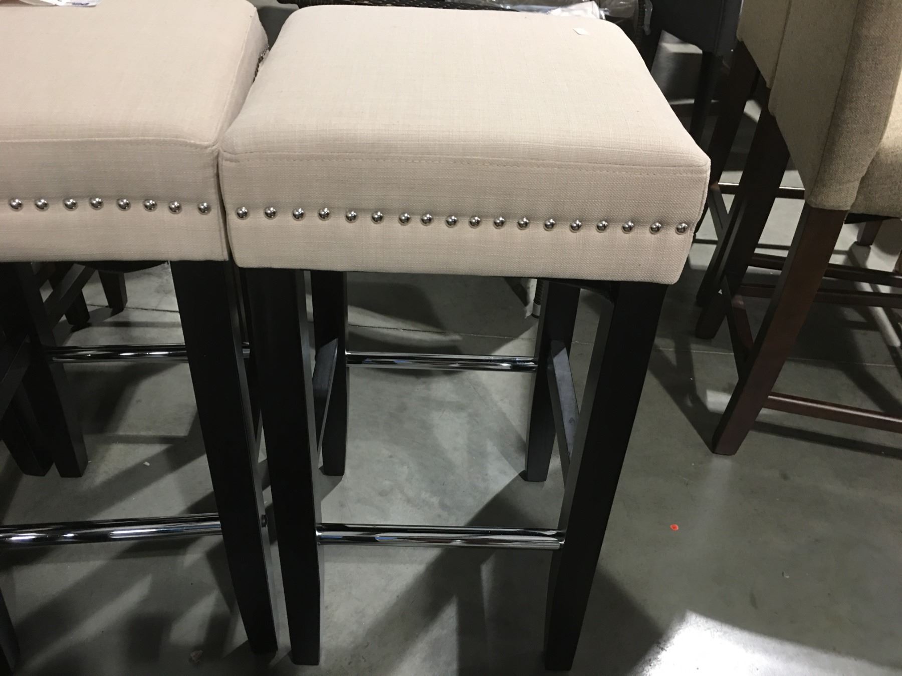 LIGHT BEIGE UPHOLSTERED STOOL 29" WITH SILVER ACCENT