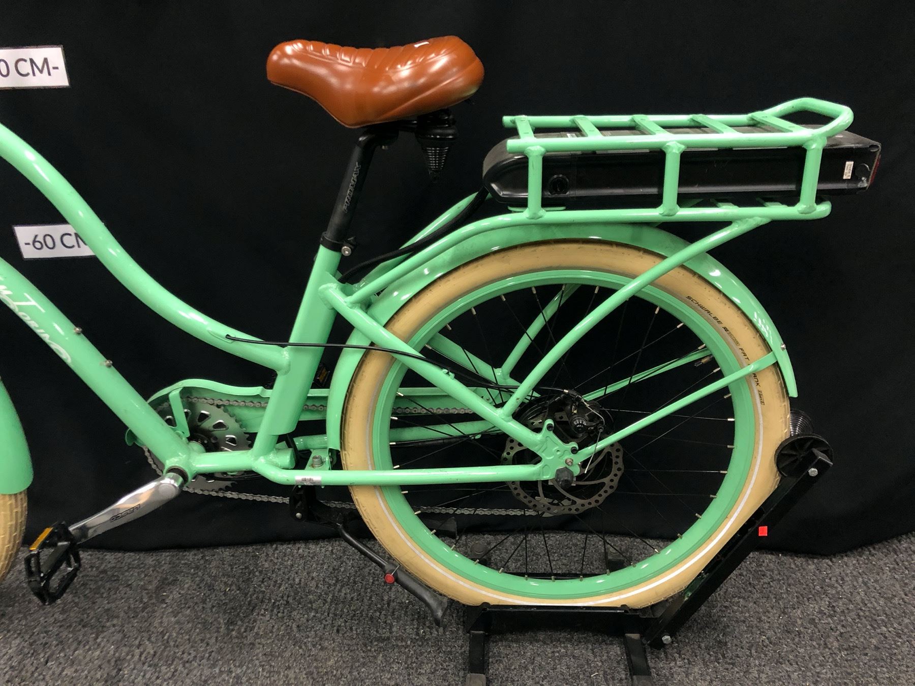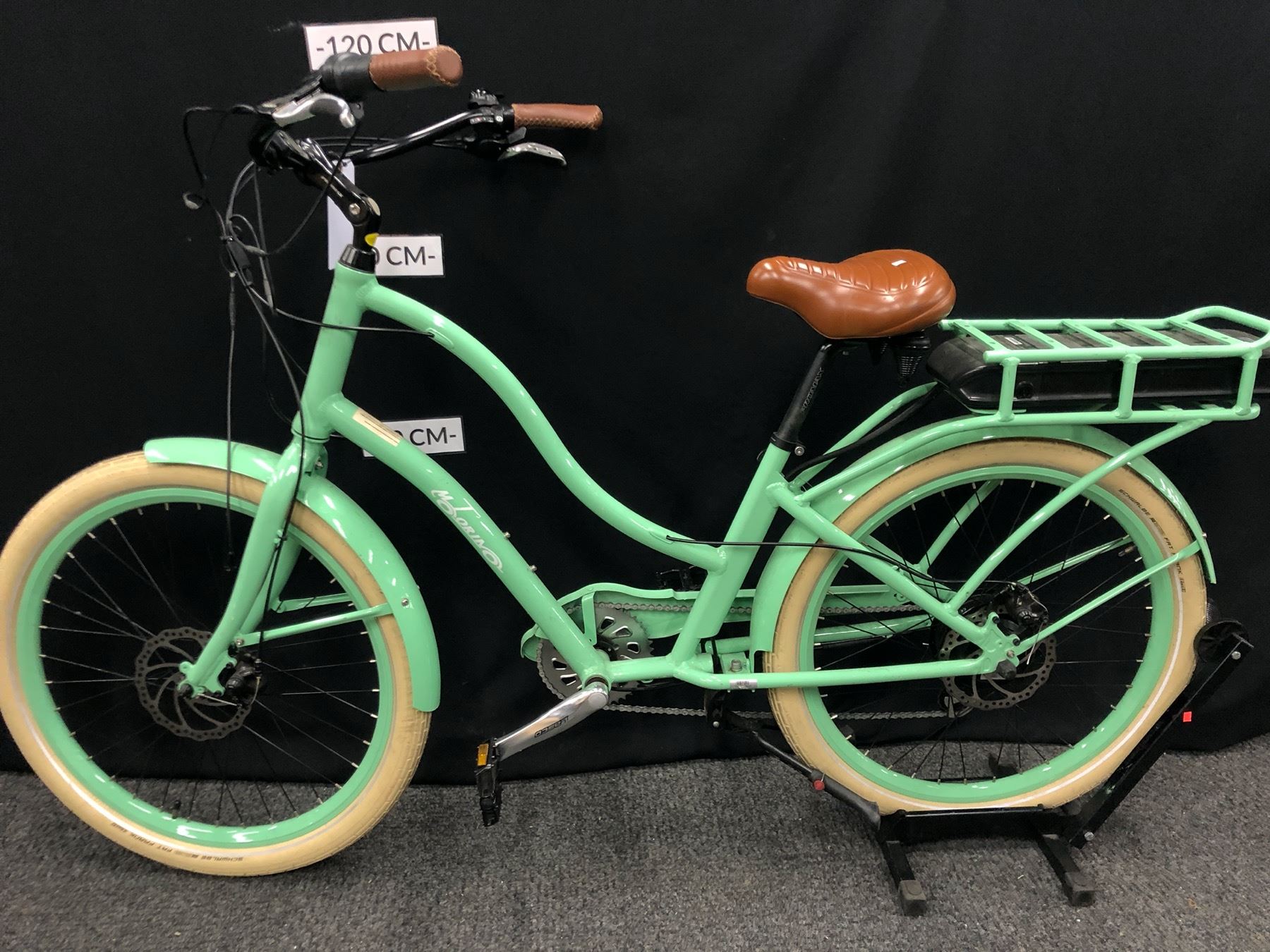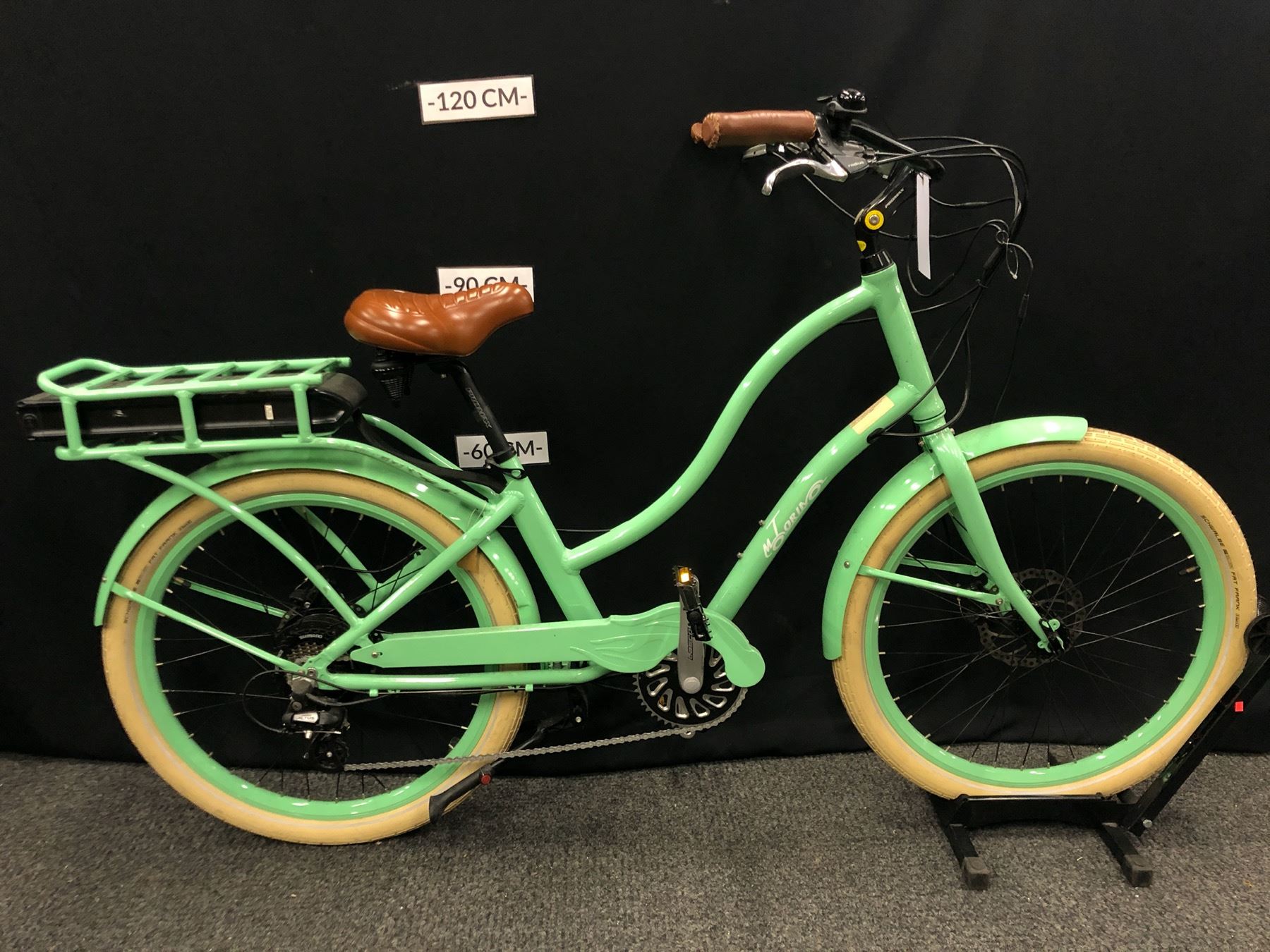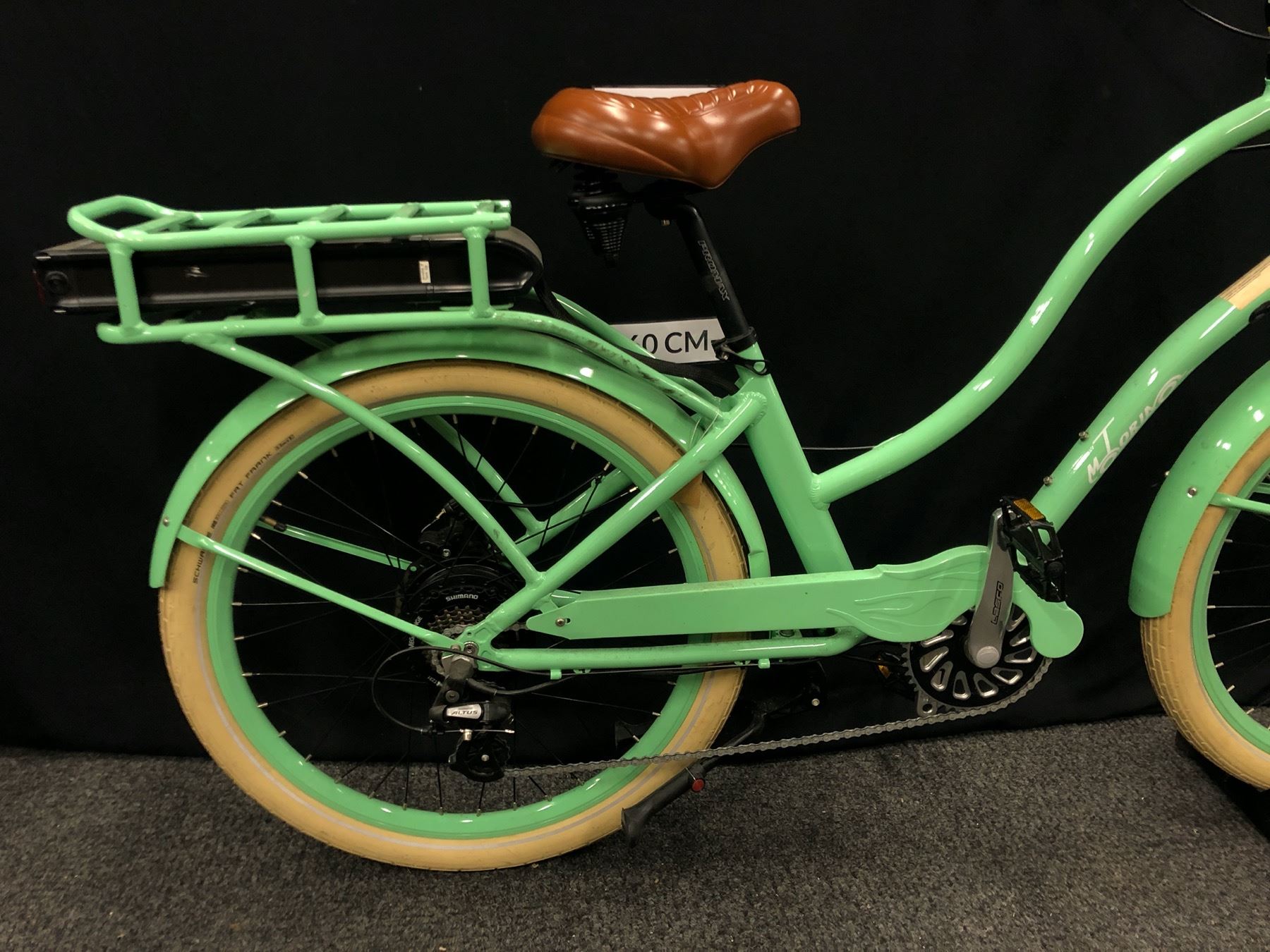 LIGHT GREEN MOTORINO 7 SPEED ELECTRIC ASSIST CRUISER BIKE WITH FRONT AND REAR DISC BRAKES, NO CHARGER, CONDITION UNKNOWN