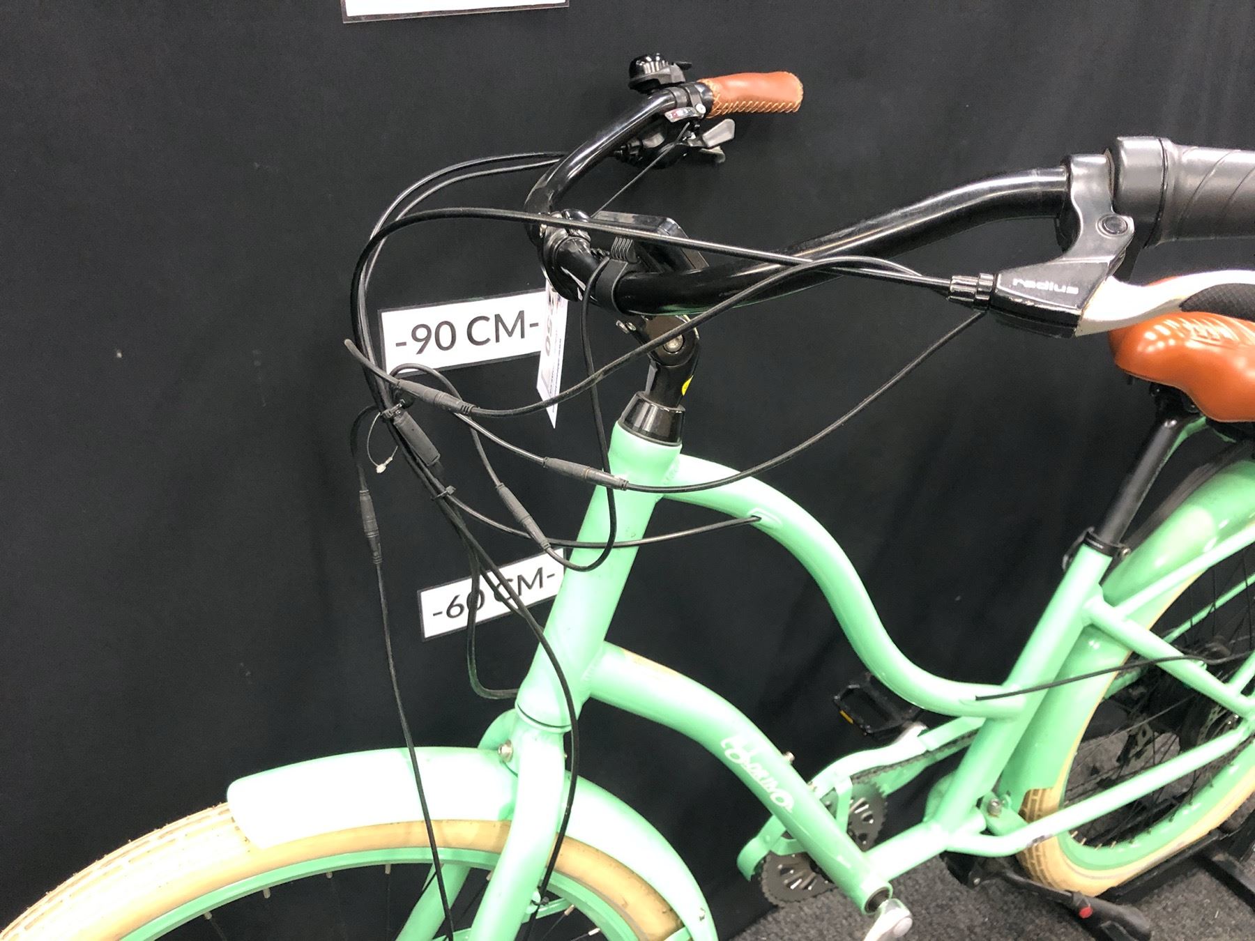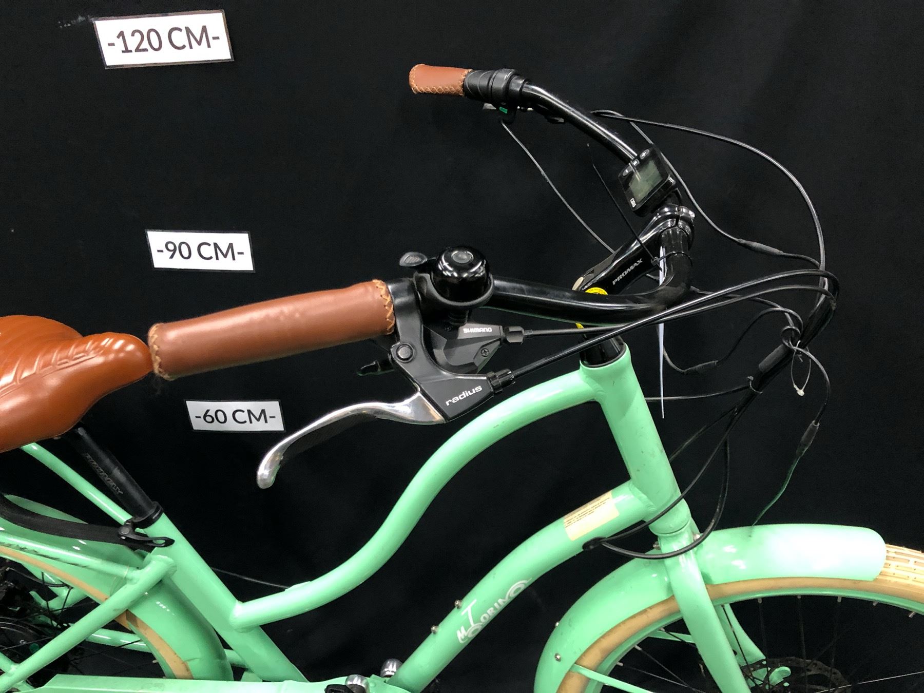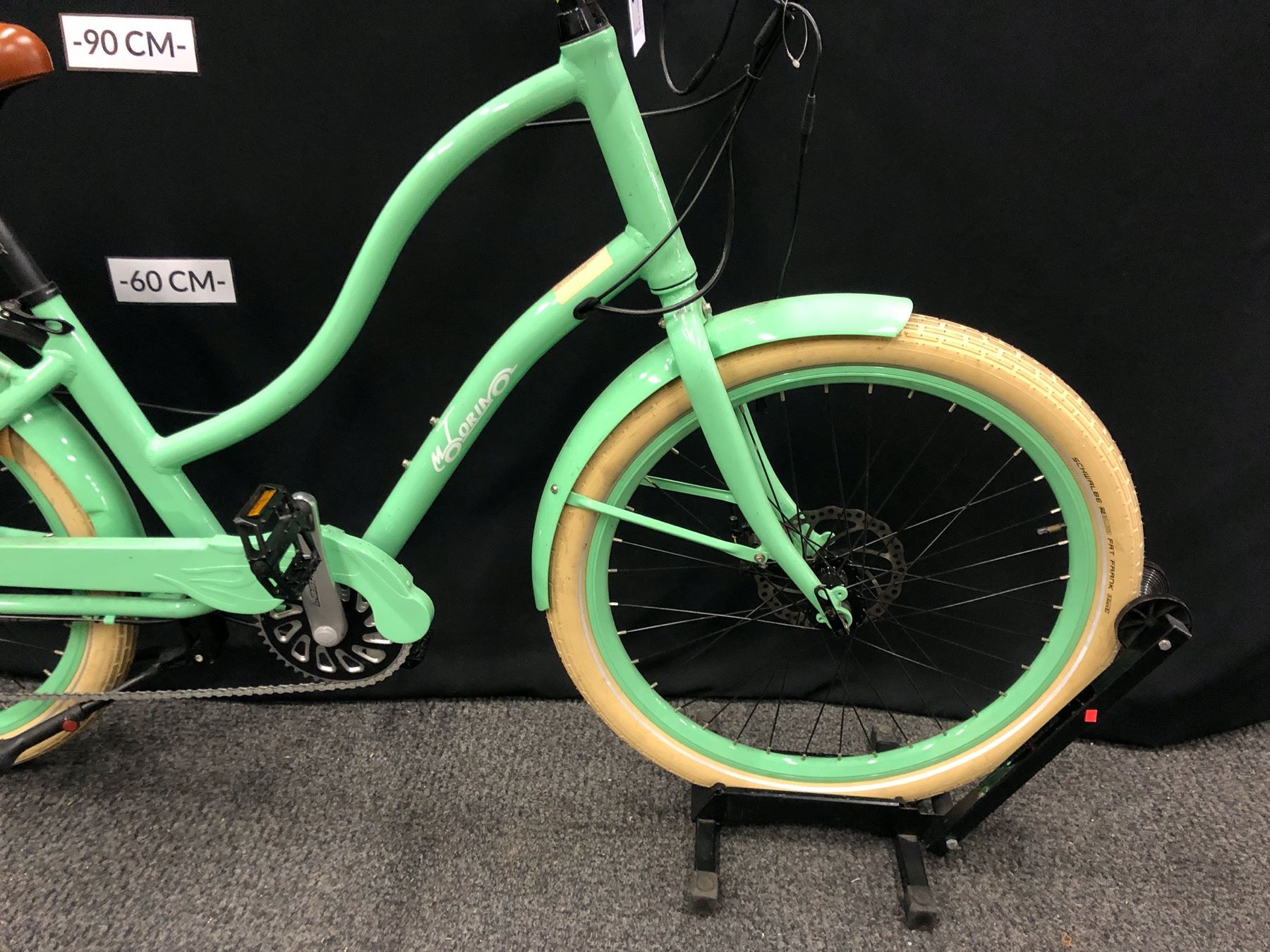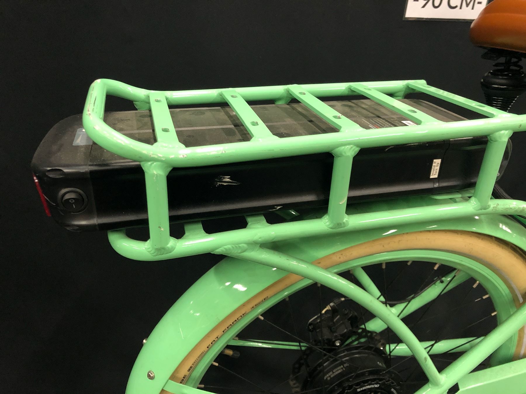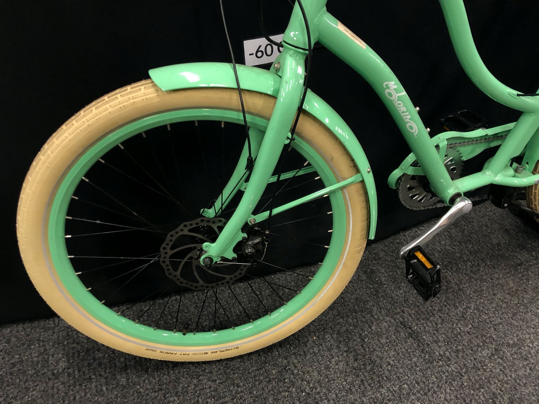 LIGHT GREEN MOTORINO 7 SPEED ELECTRIC ASSIST CRUISER BIKE WITH FRONT AND REAR DISC BRAKES, NO CHARGER, CONDITION UNKNOWN