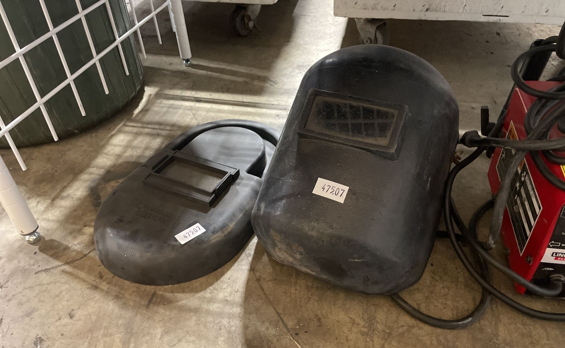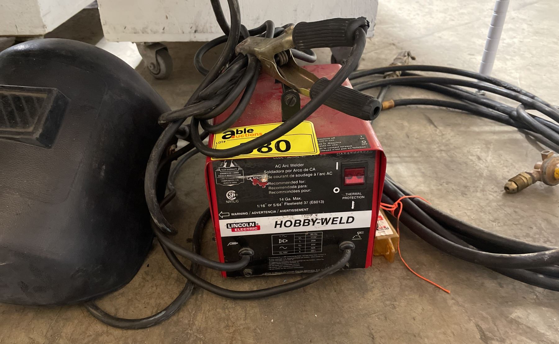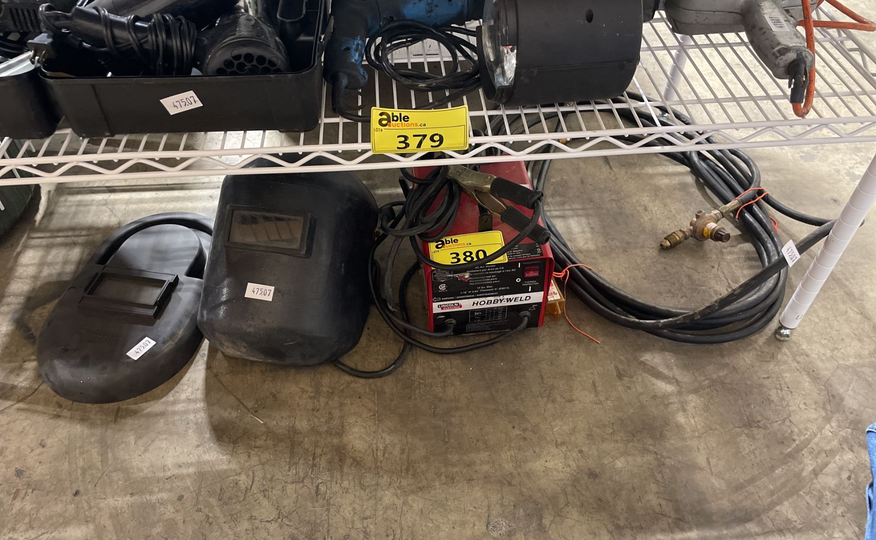 LINCOLN ELECTRIC HOBBY-WELD MINI ELECTRIC PORTABLE STICK WELDER WITH RODS, 2 WELDING MASKS, & BLACK INDUSTRIAL SPRAYER HOSE WITH TRIGGER