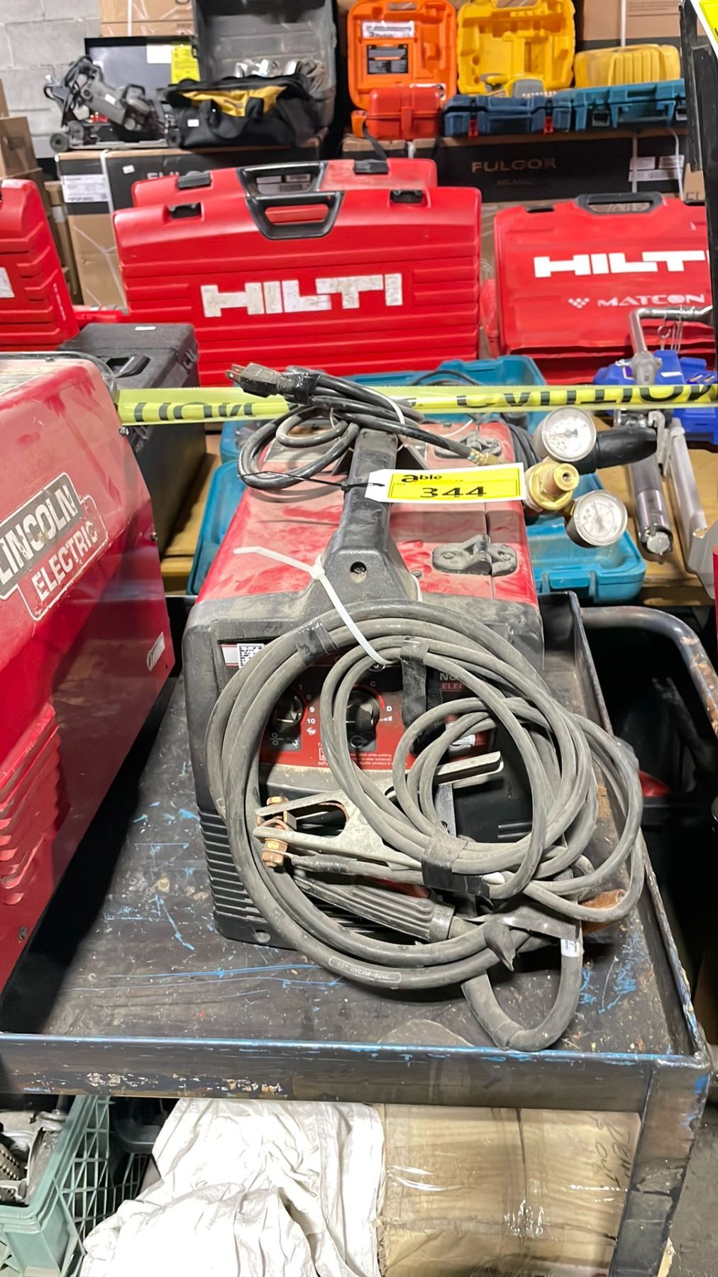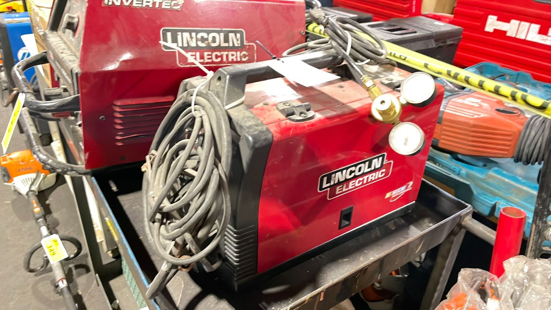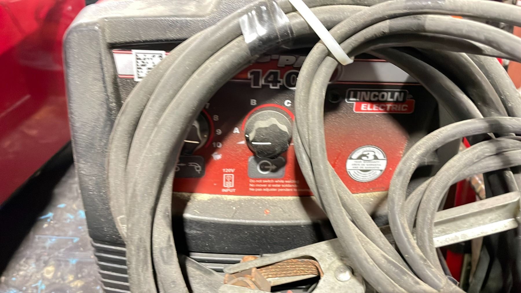LINCOLN ELECTRIC MIG-PAK 140 ELECTRIC PORTABLE WELDER POWER SOURCE WITH GROUND CABLE, STINGER, GAUGES & HOSE