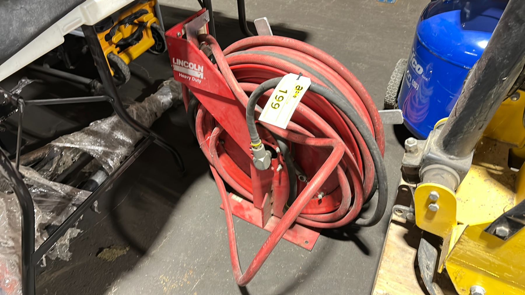 LINCOLN HEAVY DUTY INDUSTRIAL HOSE REEL WITH AIR HOSE & ASSORTED EXTENSION CORDS