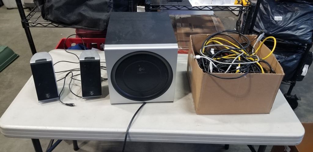 LOGITECH COMPUTER SPEAKERS WITH SUB AND ASSORTED CABLES