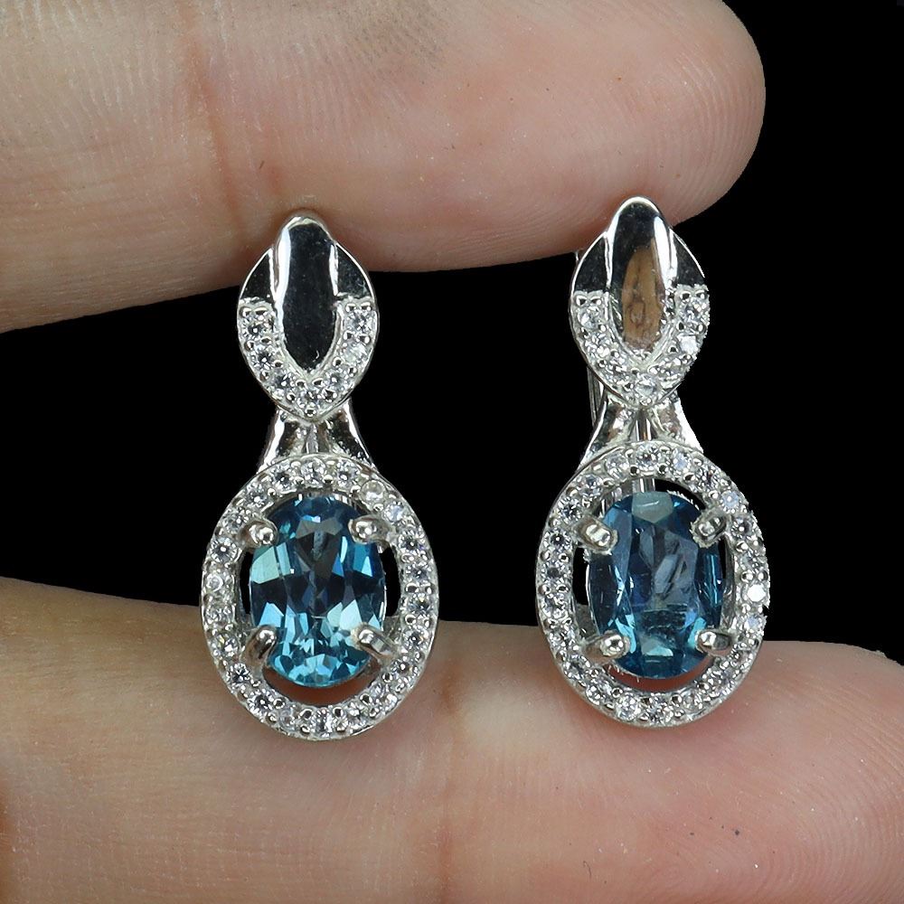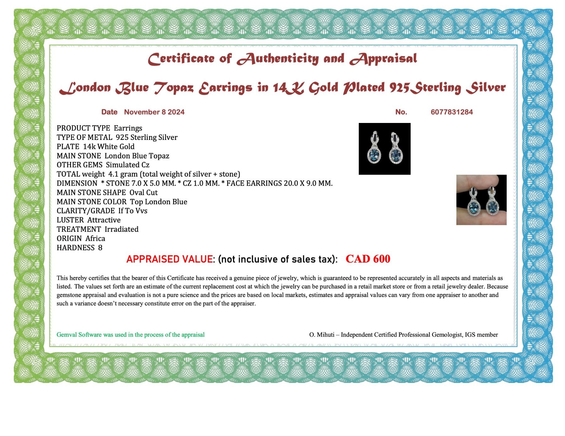 LONDON BLUE TOPAZ EARRINGS in 14K White Gold plated 925 Sterling Silver – Appraised Replacement Value CAD 600