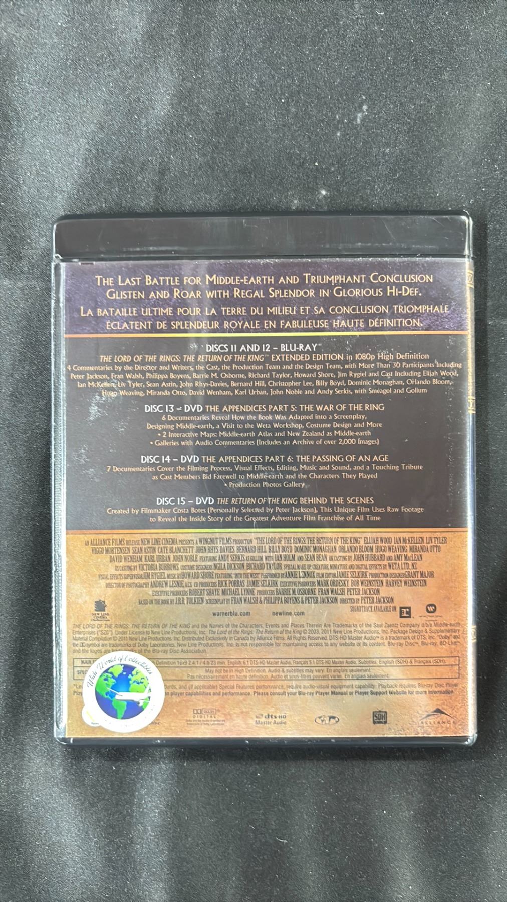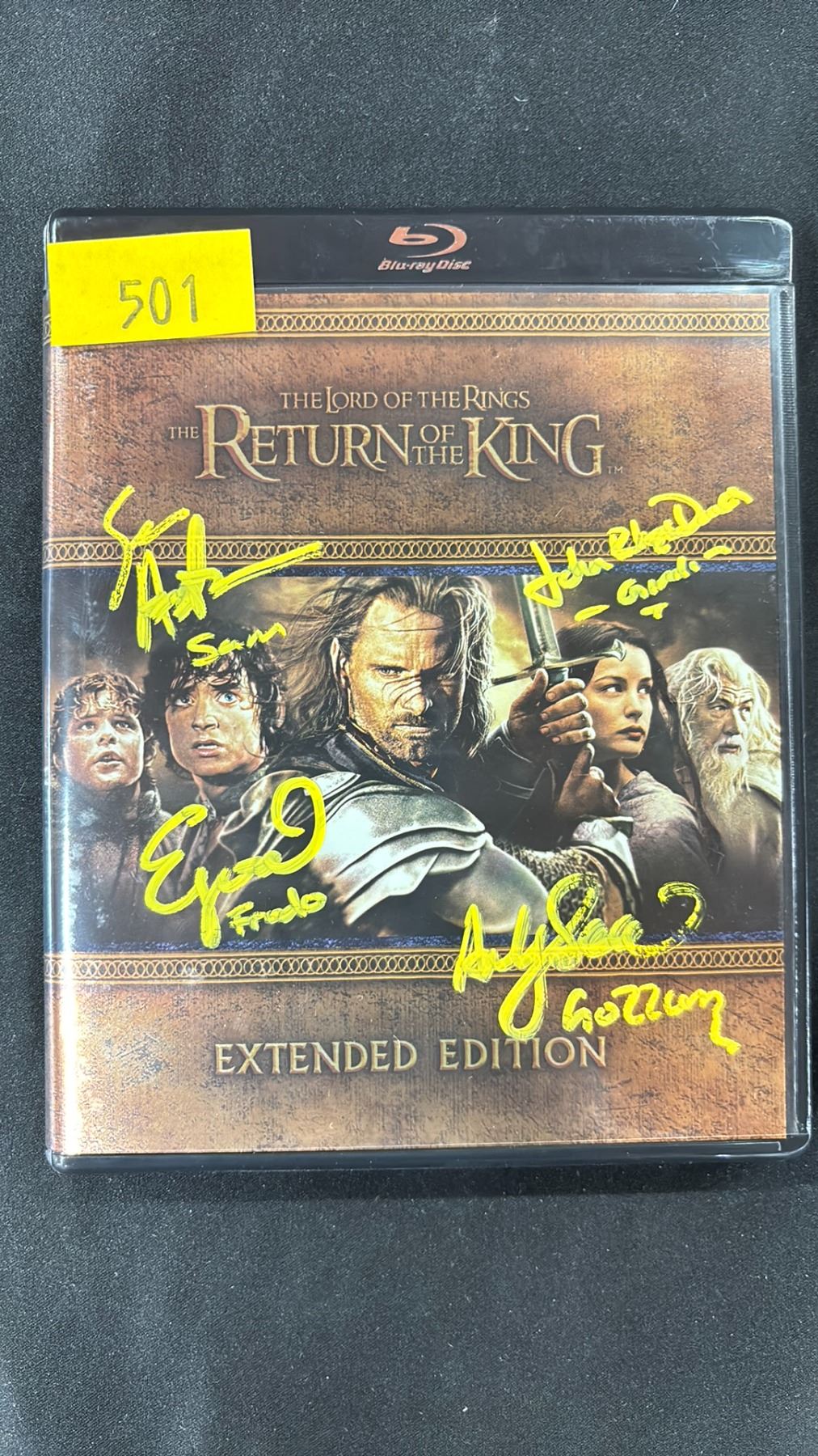 LORD OF THE RINGS RETURN OF THE KING EXTENDED EDITION BLU RAY AUTOGRAPHED BY ELIJAH WOOD, SEAN ASTIN, JOHN RHYS DAVIES & ANDY SERKIS WITH CHARACTER INSCRIPTIONS