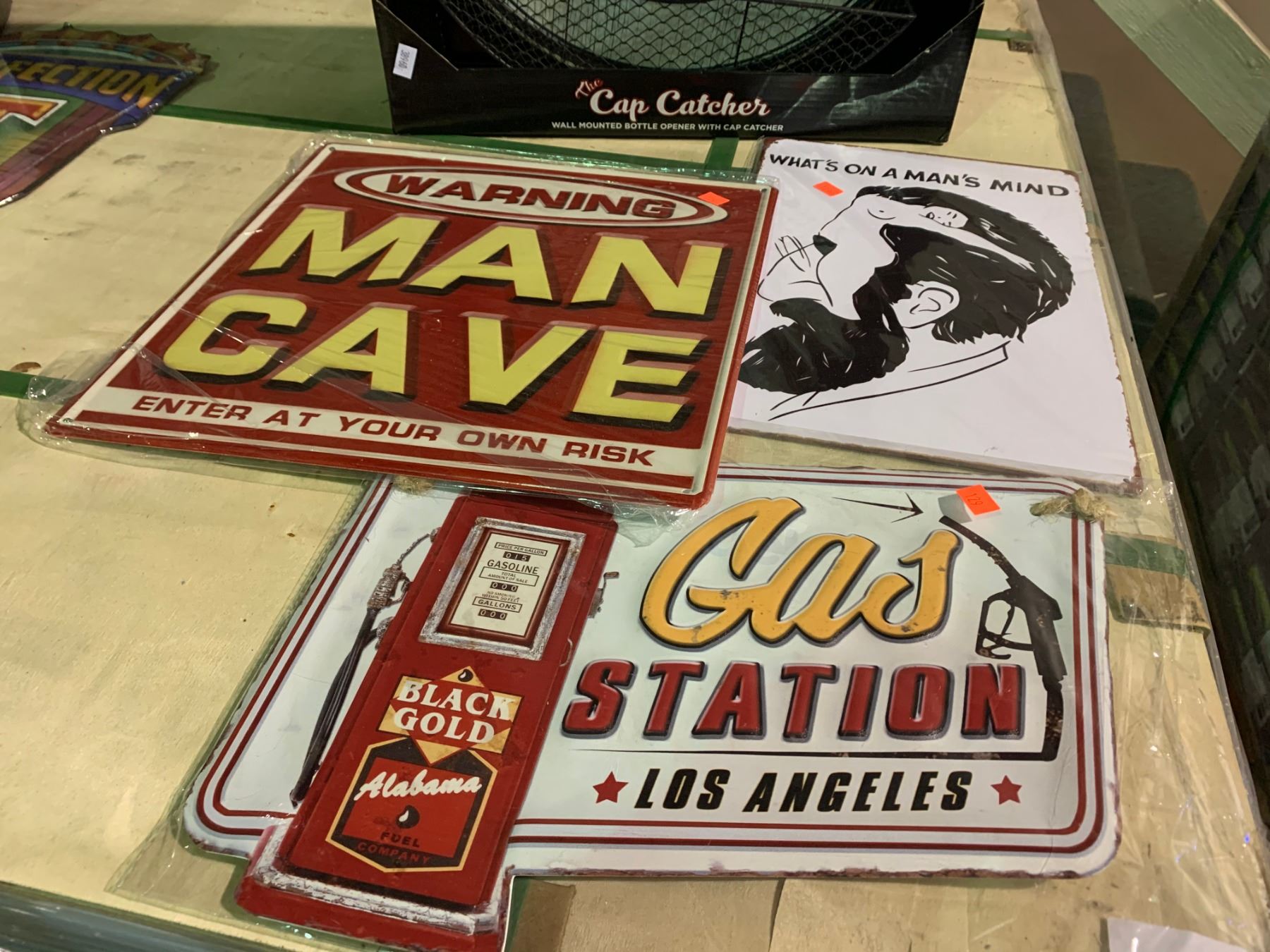LOT INCLUDING ASSORTED SIGNS & PAIR OF WALL MOUNTED BOTTLE OPENERS WITH CAP CATCHER SIGNS