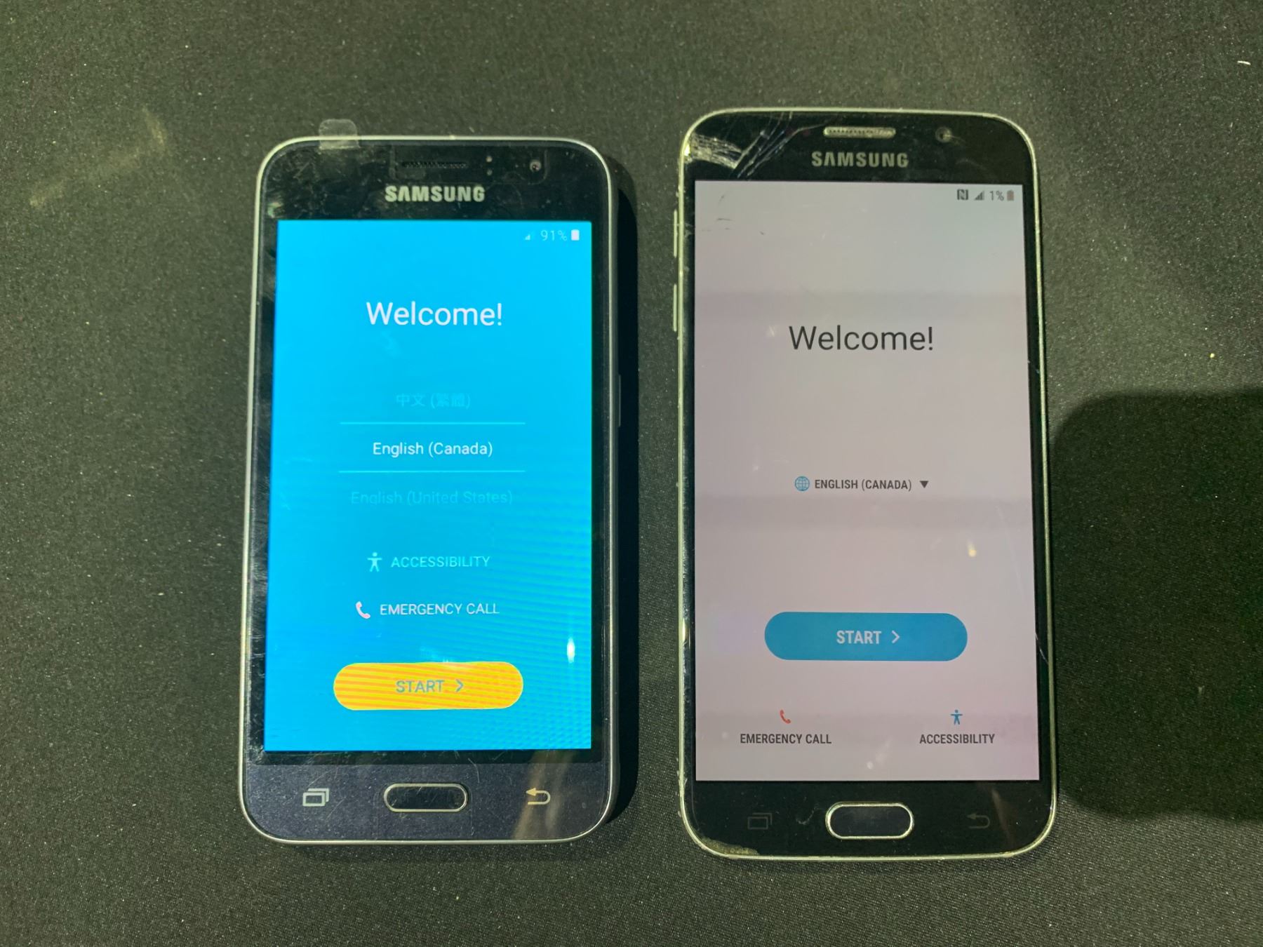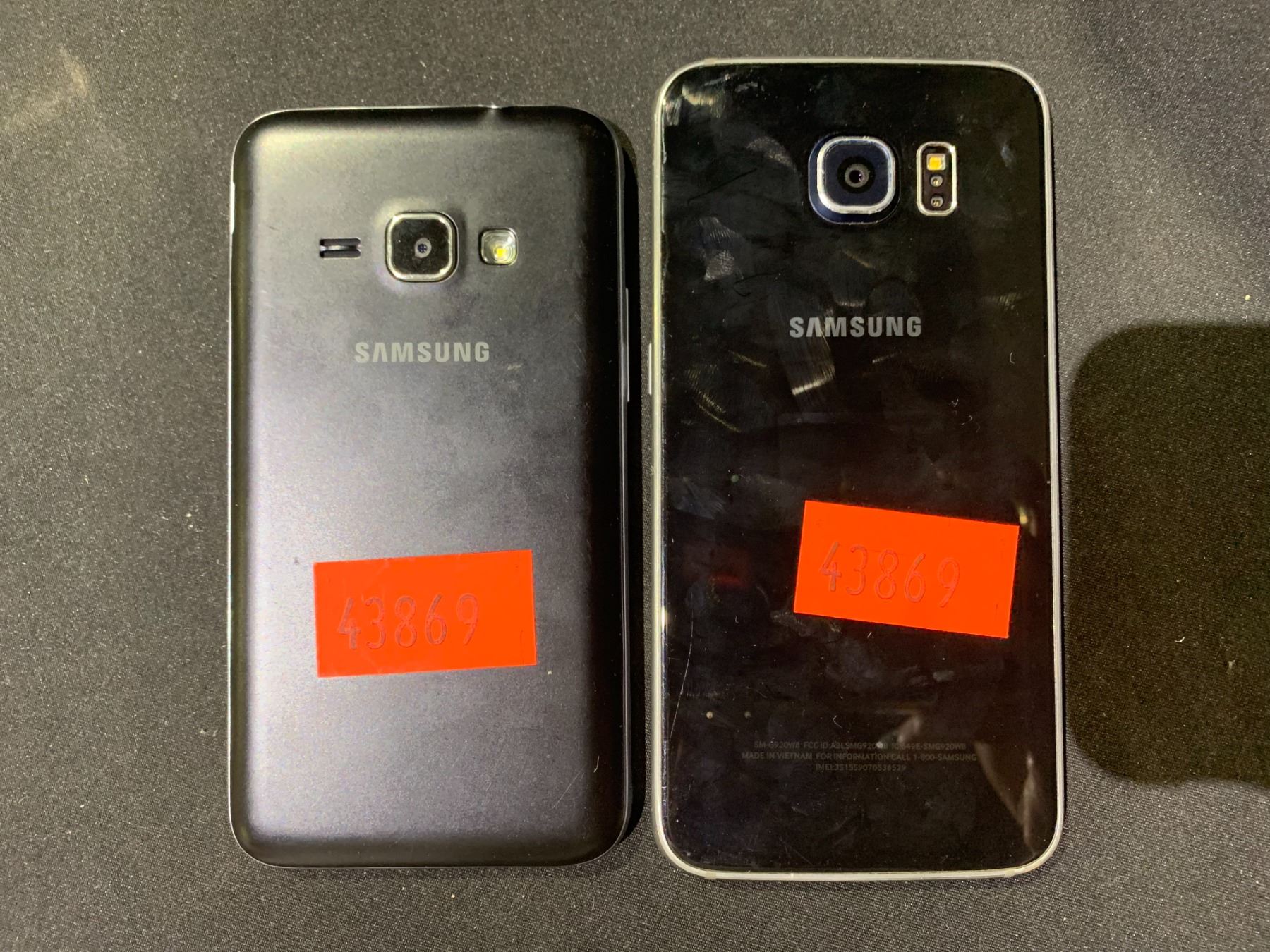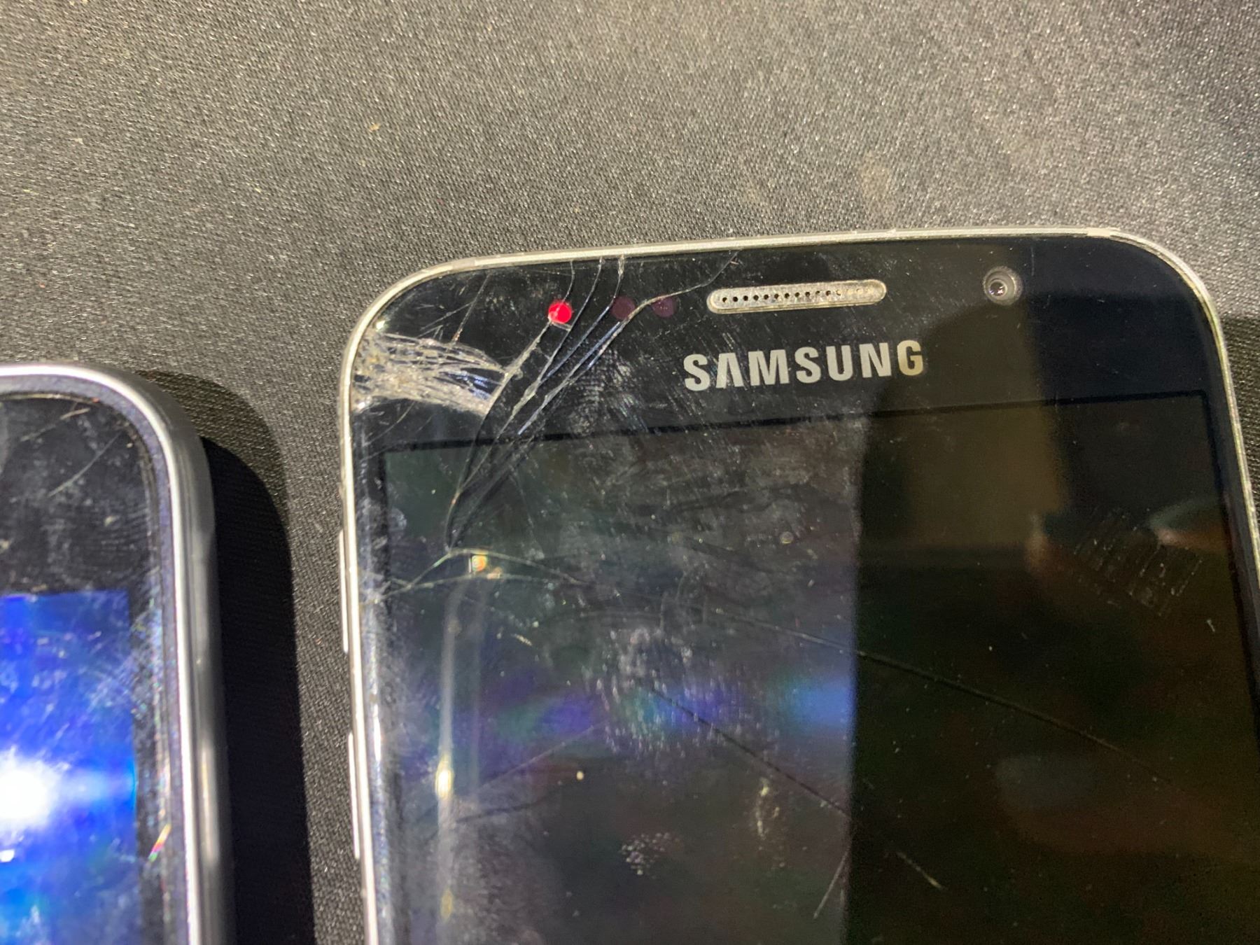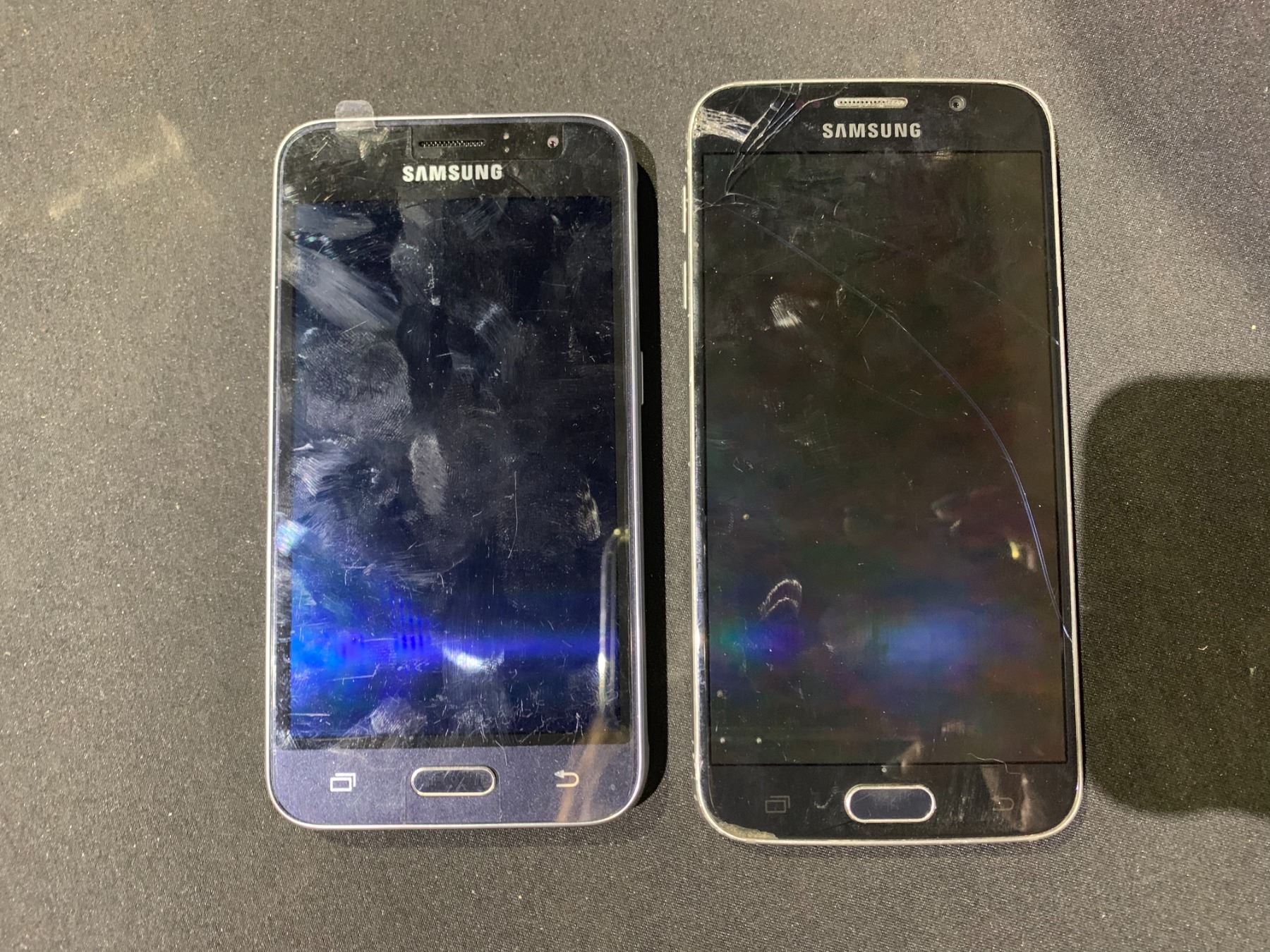 LOT OF 2 SAMSUNG GALAXY CELL PHONES- NO POWER CORDS, SCREEN DAMAGE ON ONE PHONE WIPED AND WORKING ORDER