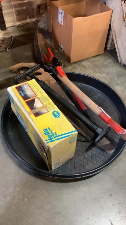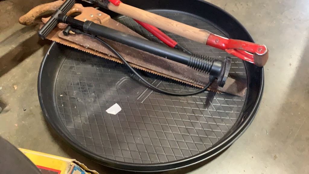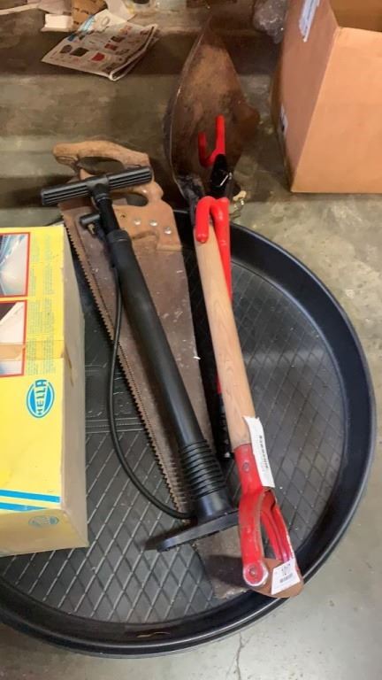 LOT OF 26"WATER HEATER PAN, HALOGEN LIGHTS WITH SHOVEL BIKE PUMP AD SAWS