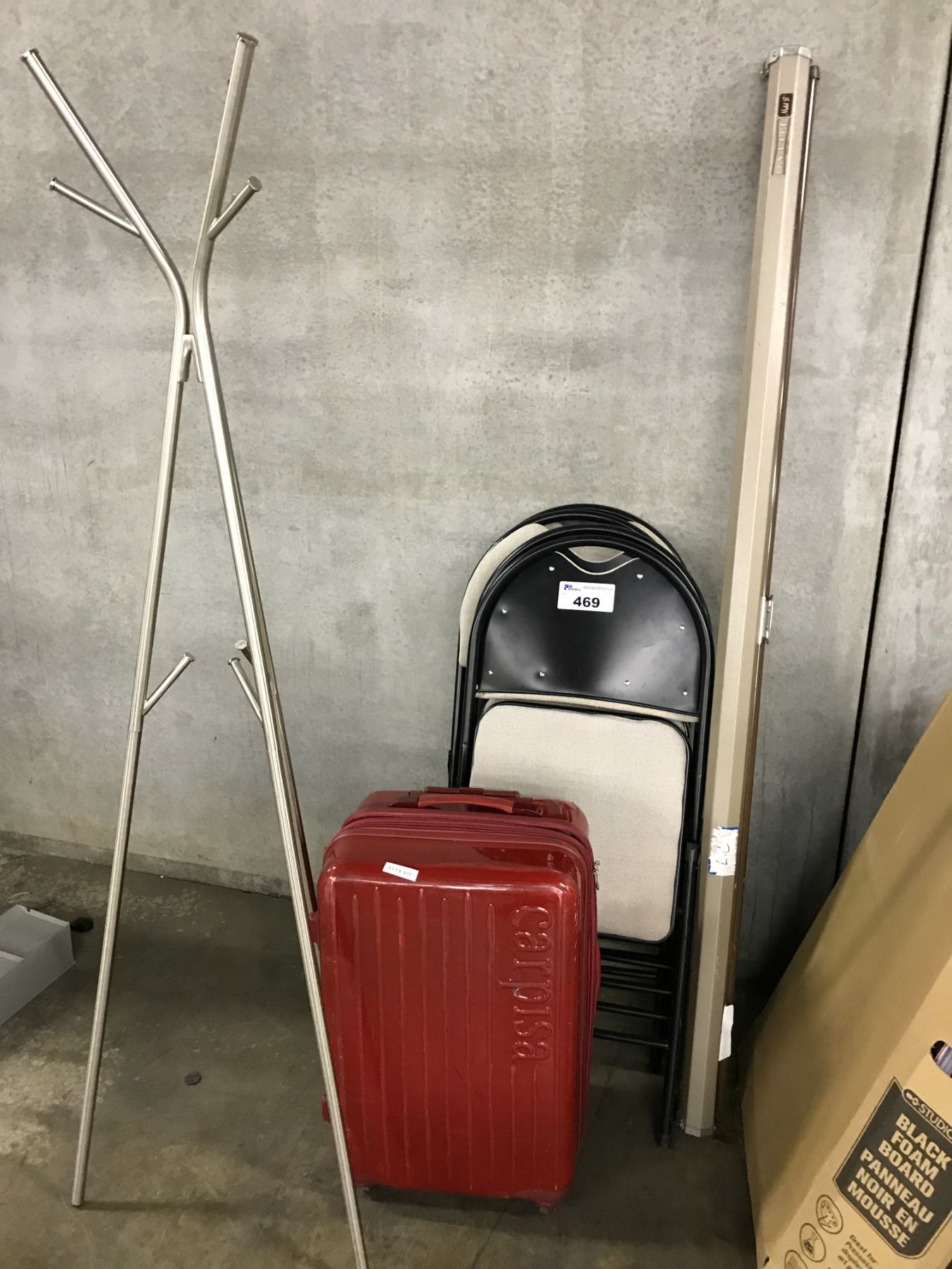 LOT OF 4 FOLDING CHAIRS, 1 PROJECTOR SCREEN, COAT TREE AND RED SUITCASE