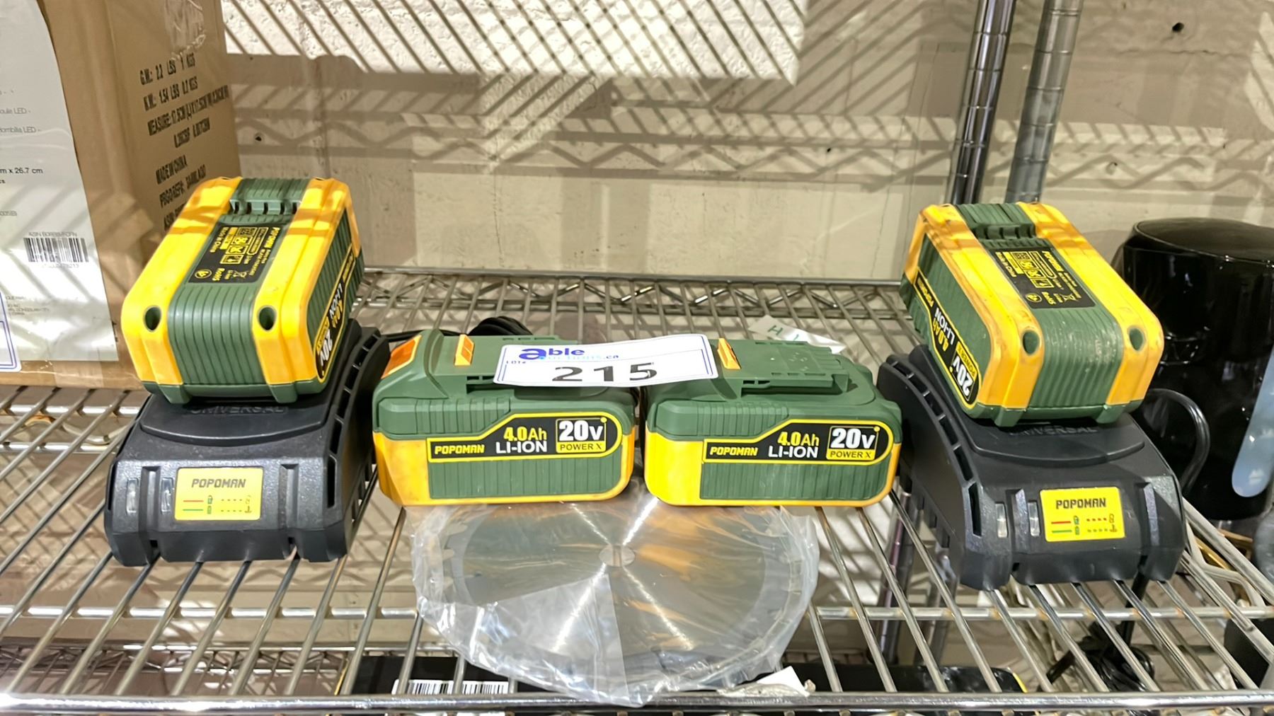 LOT OF 4 POPOMAN 20V LI-ION POWER X BATTERIES, 2 POPOMAN CHARGERS & 2 SAW BLADES