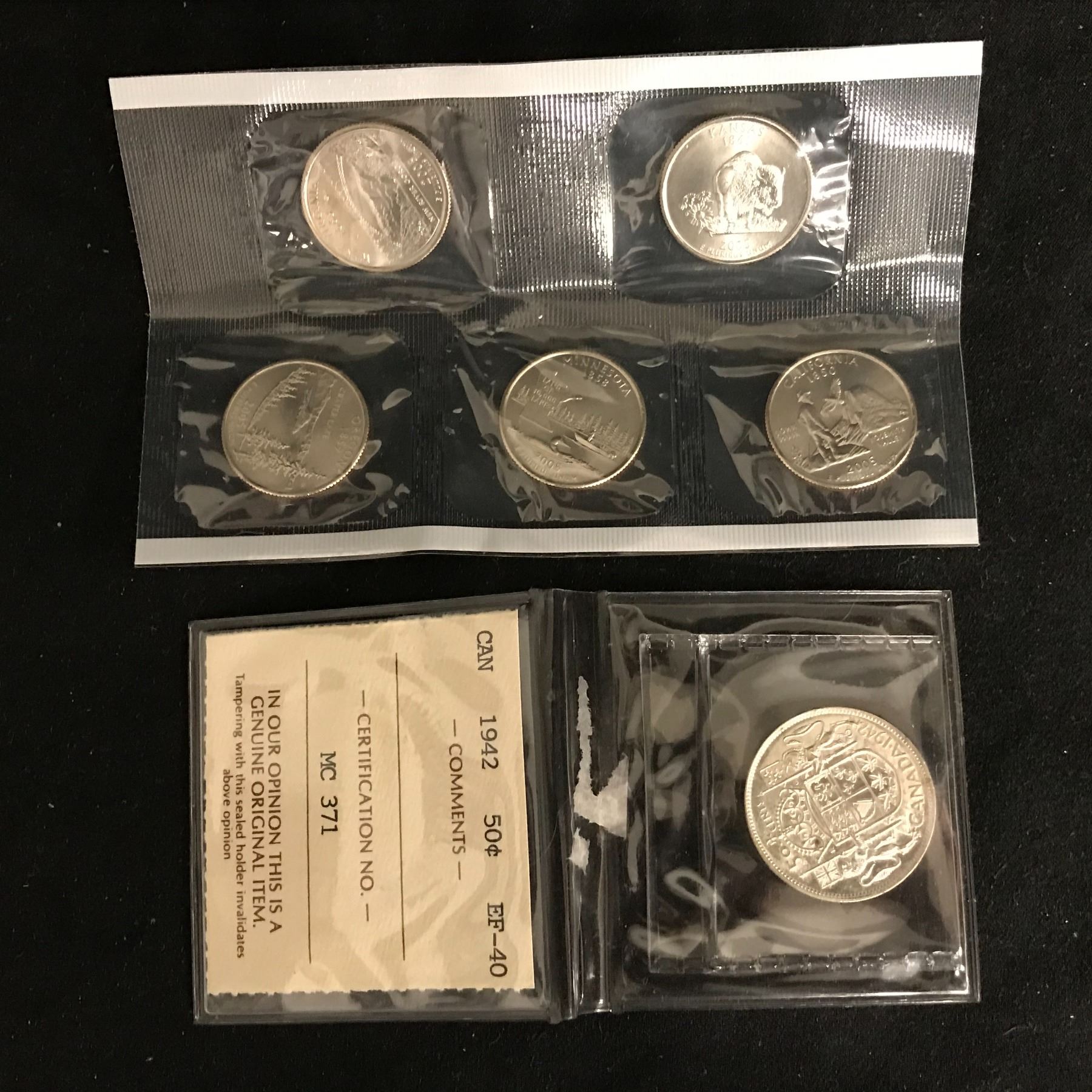 LOT OF 6 USA STATEHOOD QUARTERS AND 1942 CANADIAN 50 CENTS GRADED EF-40 .800 SILVER