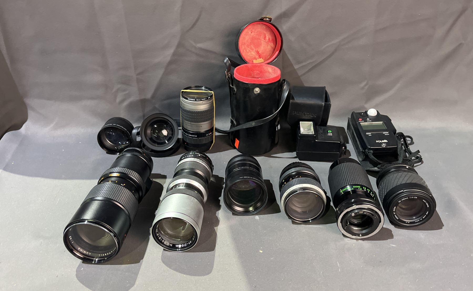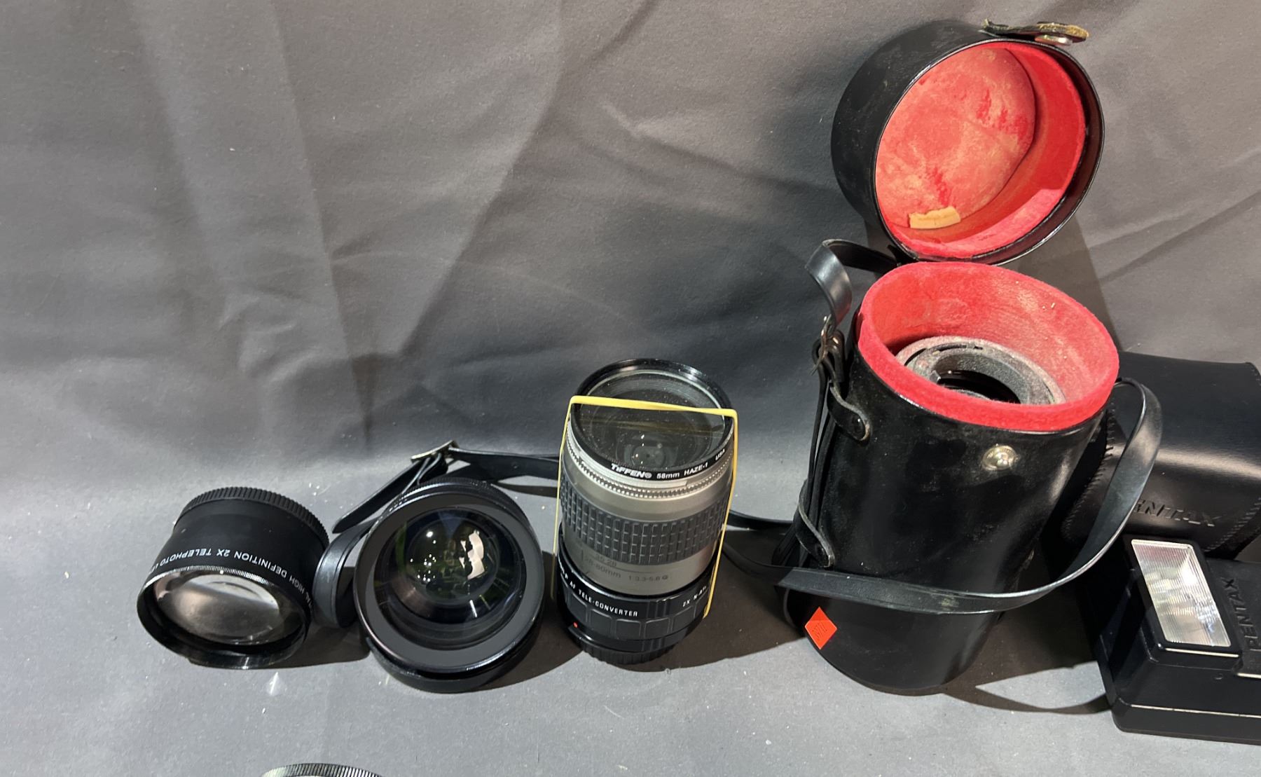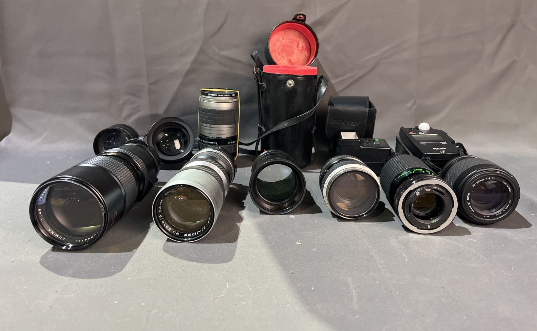 LOT OF ASSORTED CAMERA LENSES & FLASH ATTACHMENTS